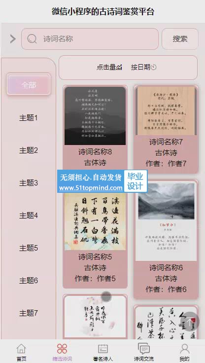 本课题旨在开发一个功能完善、用户友好的古诗词鉴赏微信小程序,以满足用户对古诗词学习和欣赏的需求。通过该小程序,用户可以方便地浏览、搜索和阅读古诗词作品,了解诗词的背景和作者的生平,欣赏名句和标注信息,同时还能够深入了解相关的朝代信息和古籍简介。通过这些功能的整合和优化,旨在提升用户对古诗词的兴趣和理解,促进中华文化的传承和发展。