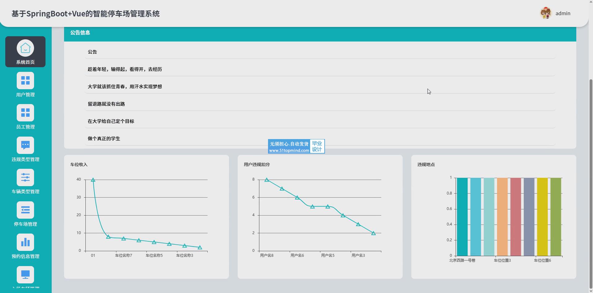 智能停车场管理系统的开发,使游客可以在页面浏览停车场、公告等各种信息,也可以注册成为平台用户[9]。用户具备信息搜索、预约的功能,可以搜索缴费信息、违规信息等信息,通过管理员的服务端审核之后,就可以展示在页面上。而管理员服务端则可以对所有的注册用户进行增、删、改、查、修改密码等基础操作。同时对于注册用户,预约信息、入场车辆、出场车辆等可以进行修改、删除等操作[10]。
