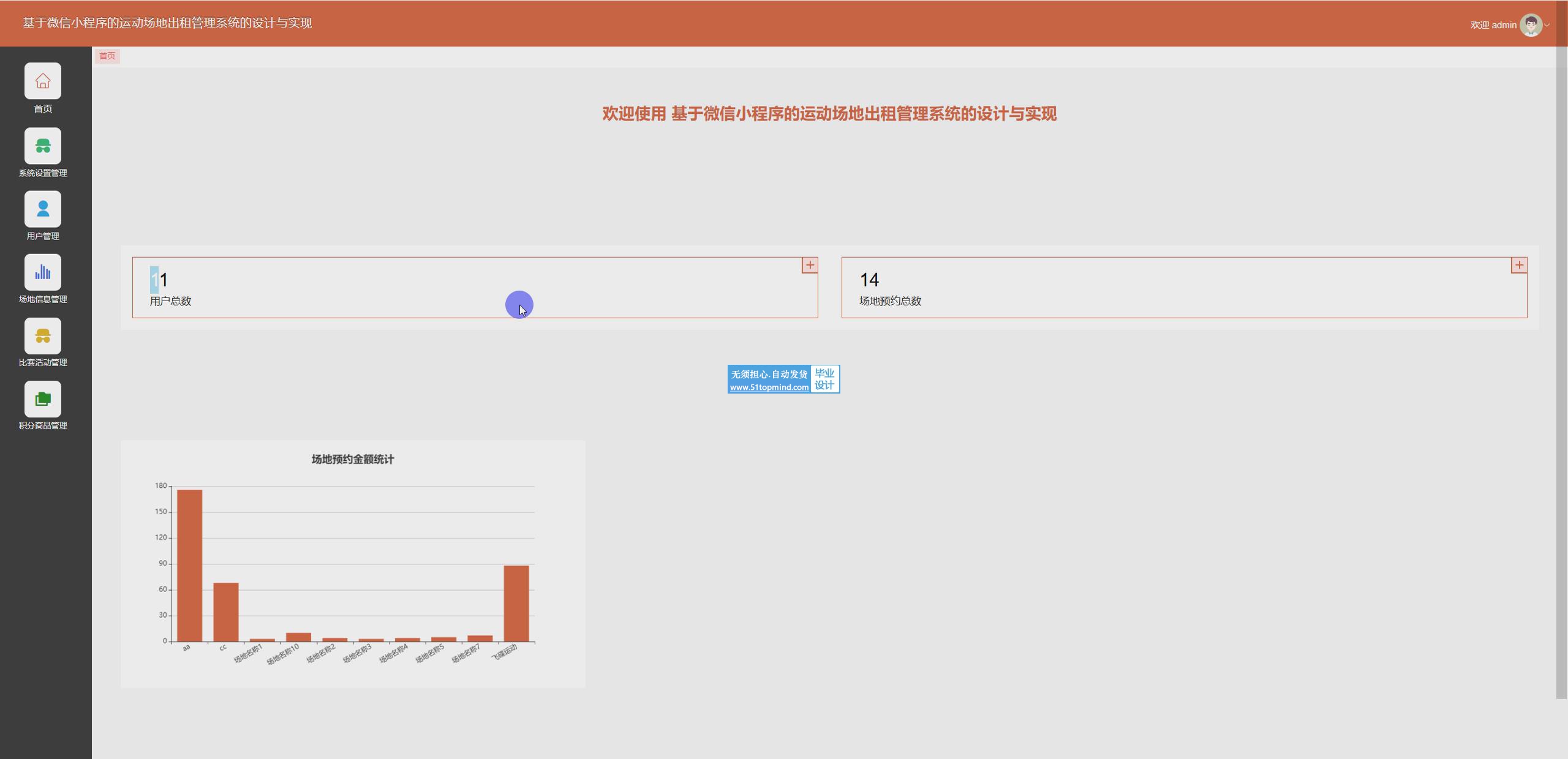 商家中心:展示商家用户的收入金额、预约统计等关键信息,帮助商家用户了解场地运营状况。