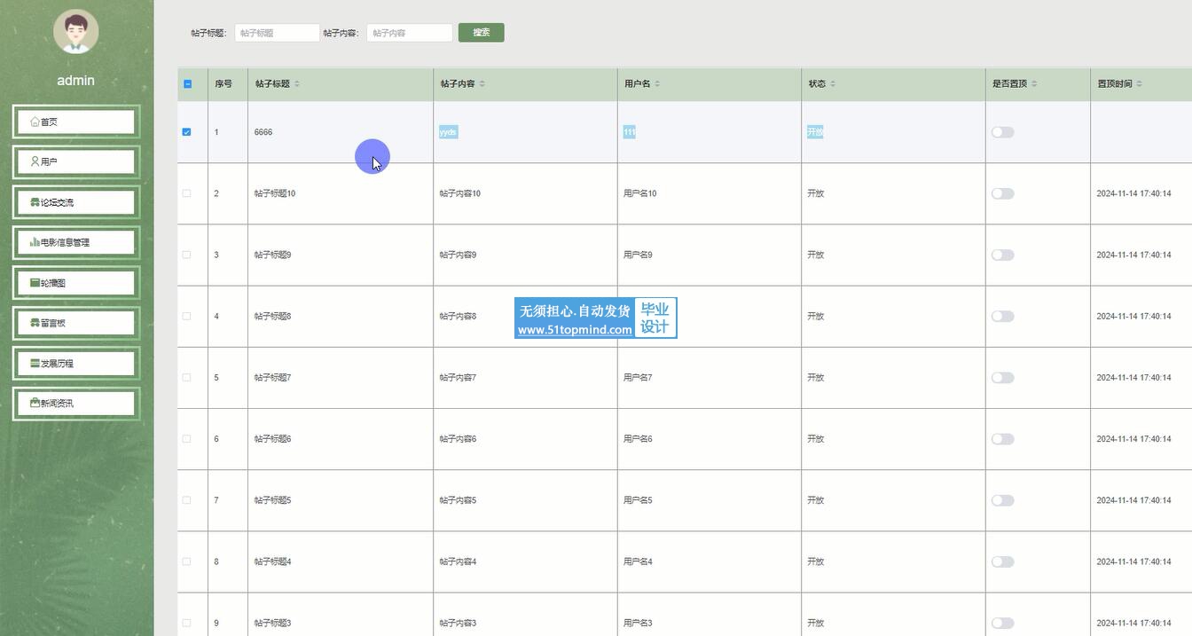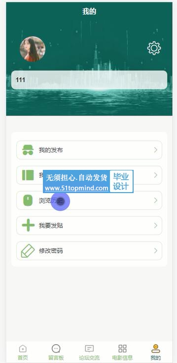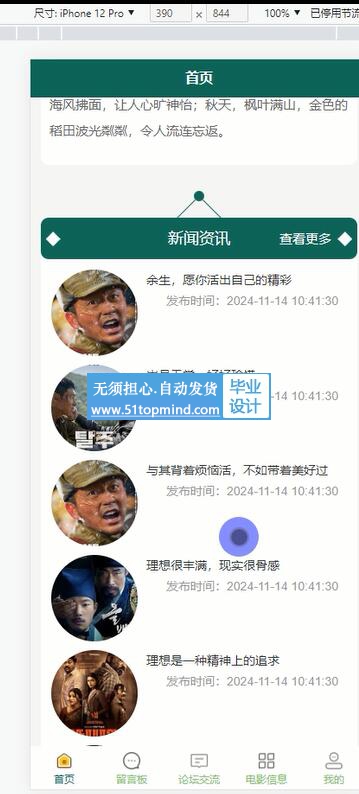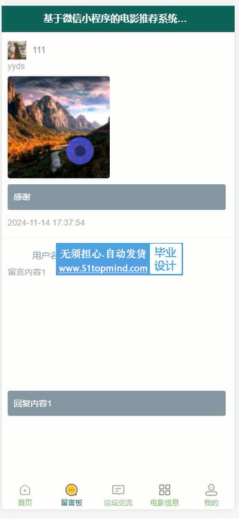 本设计主要实现集人性化、高效率、便捷等优点于一身的基于微信小程序的电影推荐系统,完成用户管理、电影管理、论坛管理、留言管理、资讯管理、数据统计等功能模块。系统通过微信小程序与服务器进行通信,实现数据的交互与变更。本系统通过科学的管理方式、便捷的服务提高了工作效率,减少了数据存储上的错误和遗漏。基于微信小程序的电影推荐系统前端基于微信小程序,后端使用Node.js语言,采用基于 MVC模式的Express框架进行开发,使用微信开发者工具和IDEA编译器编码,数据方面主要采用的是甲骨文公司的MySQL关系型数据库来作为数据存储媒介,配合Vue.js+HTML+CSS技术完成整个系统的开发。