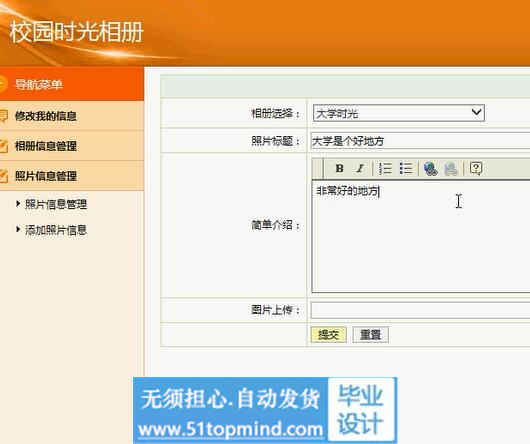 本系统前台设计主要采用了JSP作为开发语言,后台设计主要采用了MySQL作为数据库管理系统,开发环境采用了MyEclipse,服务器采用tomcat,是一种基于Web技术上开发出的B/S结构的校园时光相册。
