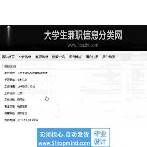 本大学生兼职系统采用了JSP(Java Server Page)作为前台开发工具,MySQL作为后台数据库进行开发。最终系统实现的系统将分为管理员、兼职用户和企业单位三个角色,系统管理员部分的主要功能包括修改登录密码、用户信息管理、信息类别管理、兼职信息管理、新闻资讯管理以及留言信息管理,兼职用户的功能主要有在线注册与登录、浏览兼职信息、在线投递简历等。企业用户的功能有:发布兼职信息,查看简历等。