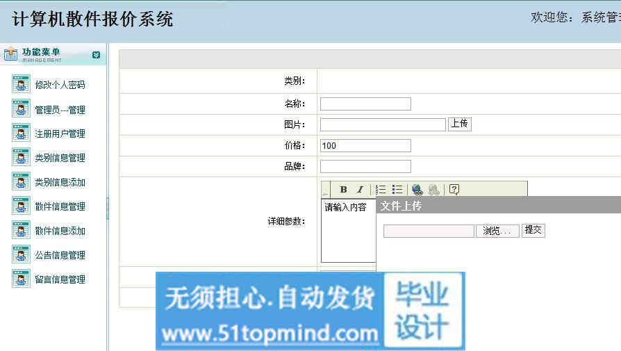 该电脑配件报价系统有java的web技术jsp开发,主要实现的功能是:普通用户可以查询自己所需要的配件信息,通过比较购买,随时了解时事配件的最新价格;管理员可以对系统进行维护管理,管理用户信息并可以重置密码,查看用户的订单并对其确认,查看,添加,删除,更改配件信息。