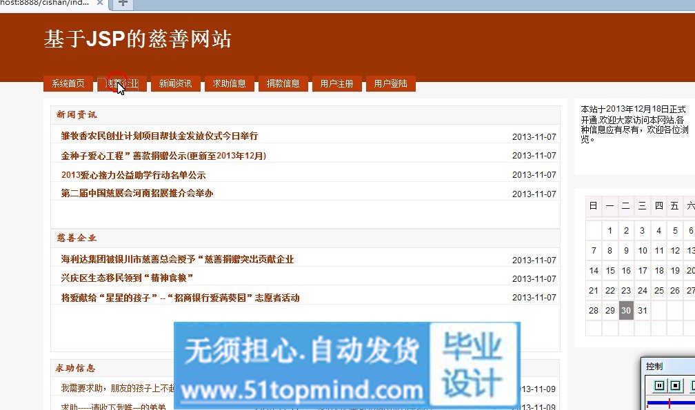 本系统采用了Browser/Server体系结构,JSP(Java Server Page)作为前台开发工具,MySQL作为后台数据库进行开发。最终系统实现的系统将分为管理员和用户两个角色,其中系统管理员部分的主要功能包括修改登录密码、用户信息管理、捐款信息管理、捐物信息管理、明星企业管理以及新闻资讯管理等,用户部分的功能包括在线注册与登录、浏览系统品信息、查看捐助信息、个人信息管理以及个人捐助管理这几个功能模块。本款物捐助系统的设计制作可以很大程度的提高款物捐助管理的效率,充分体现了信息时代的优越性。