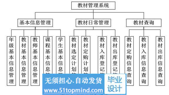 系统主要分为以下几个功能分别是基本信息管理功能、教材日常管理功能、教材各类查询功能以下几个模块,基本信息管理功能里分为对教材基本信息的管理、教师基本信息的管理、学生基本信息的管理、课程基本信息的管理,教材日常管理功能分为教材的选定、预定、入库登记和出库登记的管理,教材的查询是对入库出库购买教材的各类查询统计,具体功能模块如图