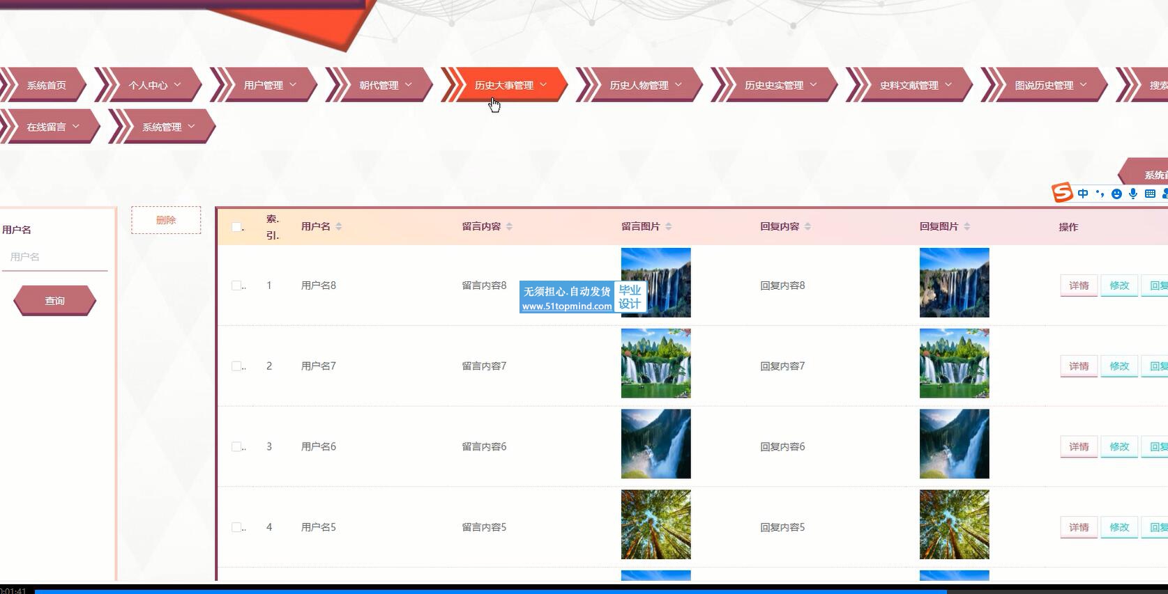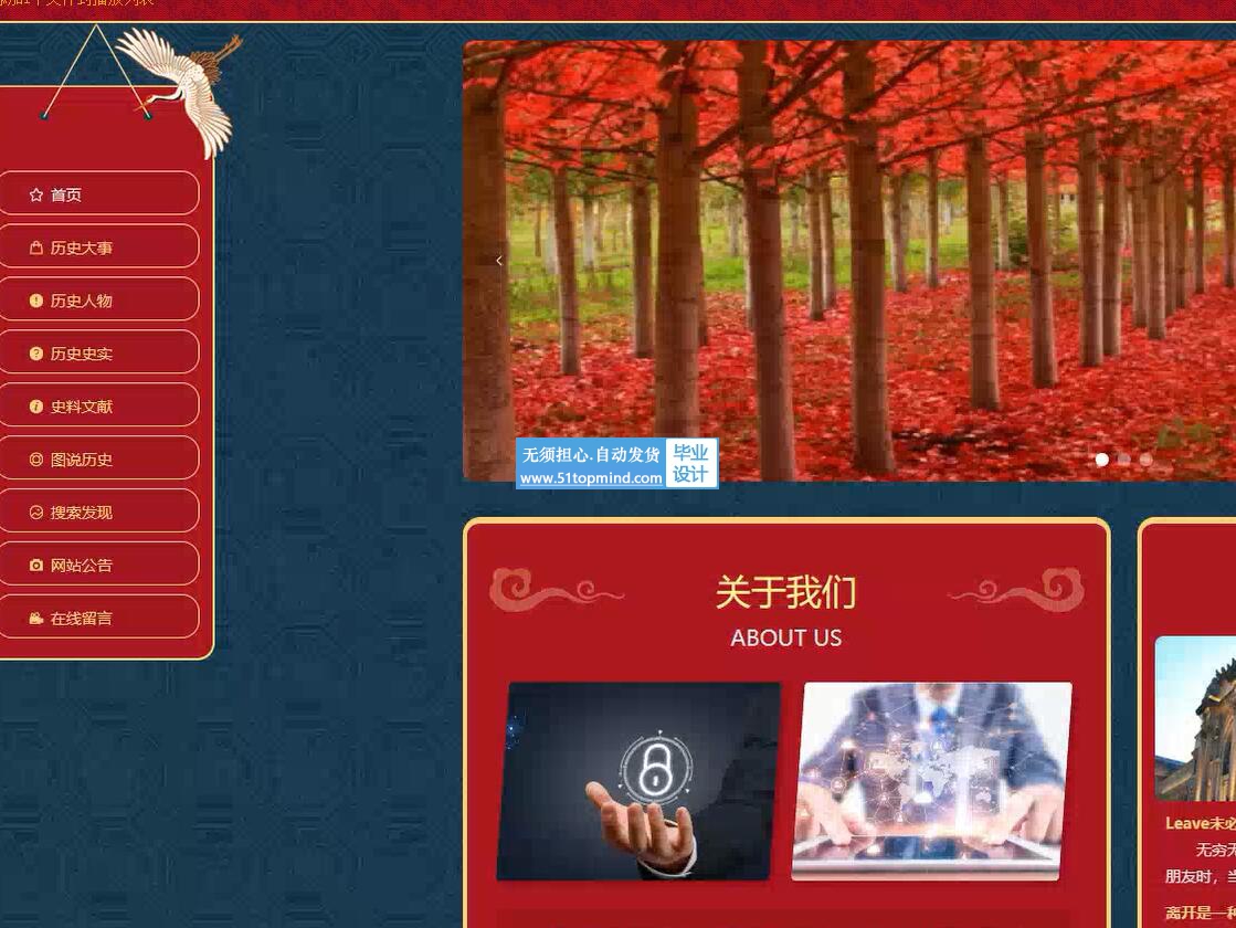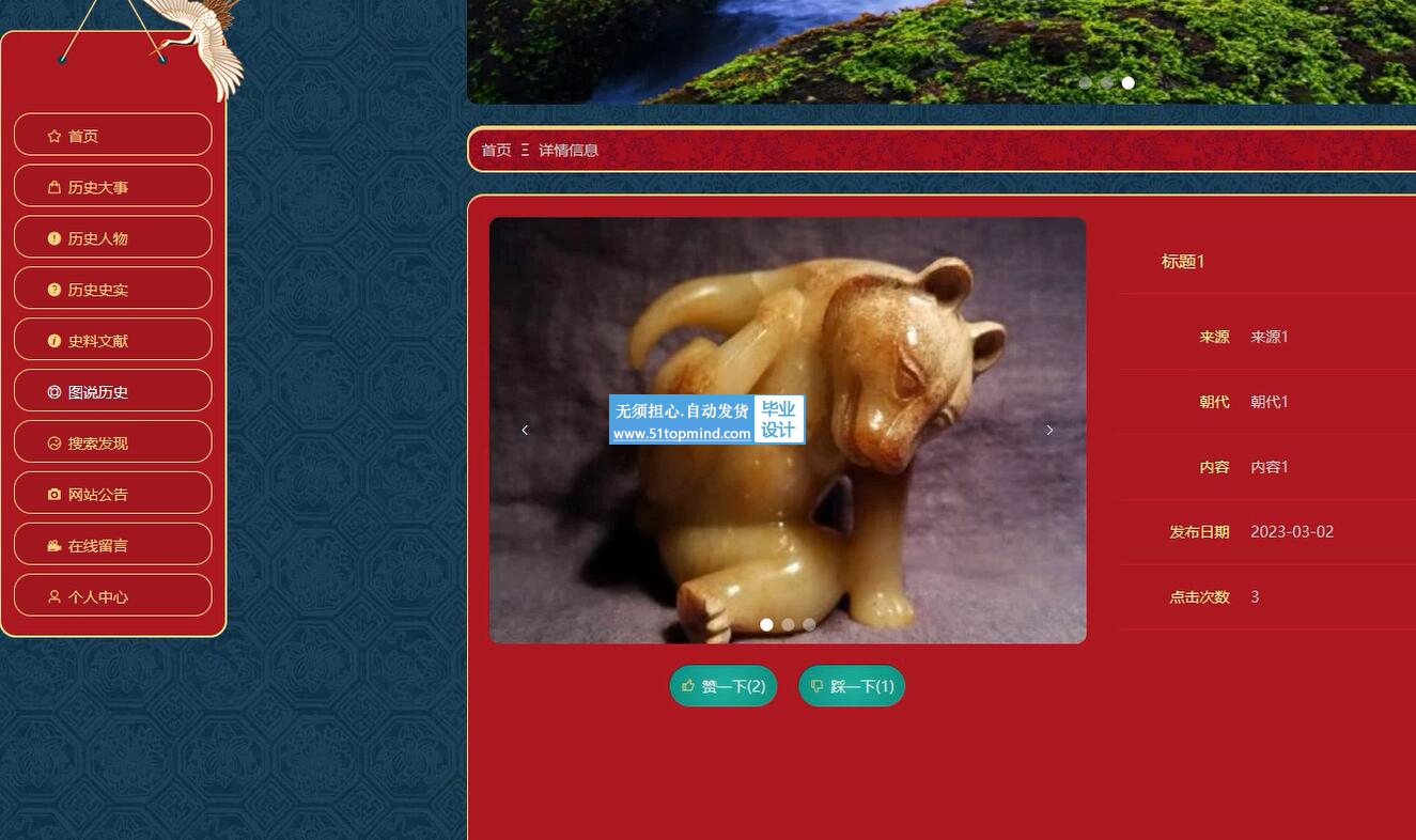 实现了一个完整的中国通史介绍网站系统,其中主要有用户模块、用户表模块、图说历史模块、关于我们模块、收藏表模块、搜索发现模块、史料文献模块、网站公告模块、在线留言模块、历史史实模块、历史人物模块、历史大事模块、图说历史评论表模块、搜索发现评论表模块、史料文献评论表模块、历史史实评论表模块、历史人物评论表模块、历史大事评论表模块、配置文件模块、朝代模块、关于我们模块、账户的注册与登录等功能模块。本文详细介绍了该中国通史介绍网站系统的设计过程,并通过全面测试,完善了预期的功能。研究表明采用B/S架构,通过Vue.js框架以及Mysql数据库可以构建一个完整中国通史介绍网站系统。最后,整个论文从系统分析、设计、实现以及最后的测试做了一个合理的安排。通过最终的研讨做出一个可行性的方案,在完成以后我们做了详细的介绍并找出系统的不足之处,从而来弥补系统的完善,最终打到符合毕业答辩要求的标准