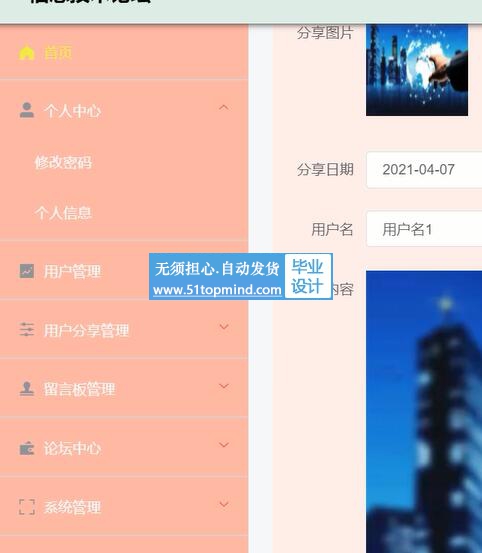 本系统是针对广大信息技术爱好者进行设计的,主要用户分为系统管理员和普通用户,普通用户权限有分享视频,图片,网址,还有有发表帖子、回复帖子和个人中心等权限,而管理员除了普通用户的权限外,还有删除帖子,删除回复,管理用户等权限。本系统主要采用的开发工具是eclipse/idea、tomcat和mysql以及java+vue.js。本系统所要完成以下几个主要功能,用户的注册、登录功能,新的用户可以通过注册一个新的帐号而登录系统,而老的用户则可以直接用之前注册的用户名登录。用户修改资料功能,用户可以根据自己的喜好随意修改个人资料,体现每个人的个性。发帖功能,所有注册成为会员的用户都可以根据自己的喜好进行发帖。回帖功能而每个人也可以对帖子的内容发表自己的观点进行回帖。帖子管理功能,管理员可以根据相关的法律要求对帖子的内容进行管理,可以将那些不符合法律要求的帖子进行删除处理。用户管理功能,管理员可将那些违反论坛管理条例的用户进行管理,例如删除他的用户权限,使其无法再次登录系统。