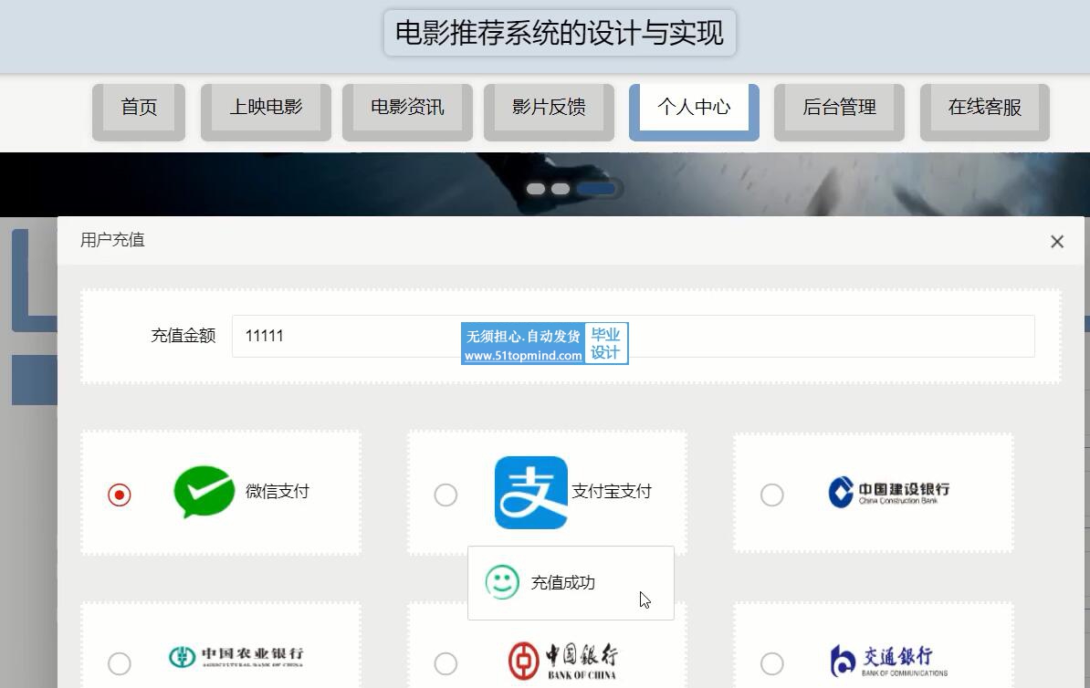 本系统共分成两个界面:一个界面用于管理员登录,主要负责进行上映电影和查看影片反馈;另外一个界面用于用户登录,主要负责浏览首页,修改个人信息等。