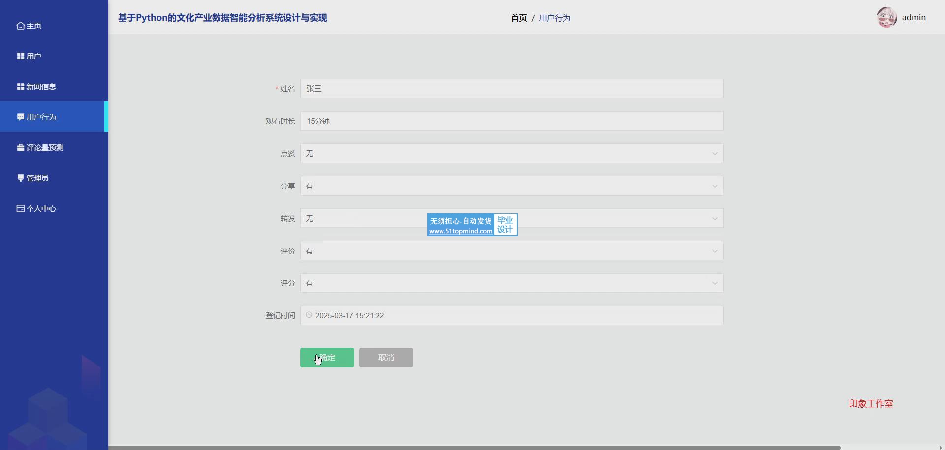 本系统利用Python语言进行开发,前端运用了html+css+javascript,后端选择flask框架,数据库则采用mysql,该系统依靠爬虫获取新闻信息,并凭借用户行为数据完成评论量预测工作,用户功能包含主页浏览、新闻查看、评论量预测以及个人中心操作等,而管理员功能涉及用户管理、新闻信息处理、用户行为分析以及评论量预测监督等方面,其中,系统最重要的部分就是根据数据分析模型来预估新闻评论量,从而帮助我们更好地改进内容并做出正确的决定。