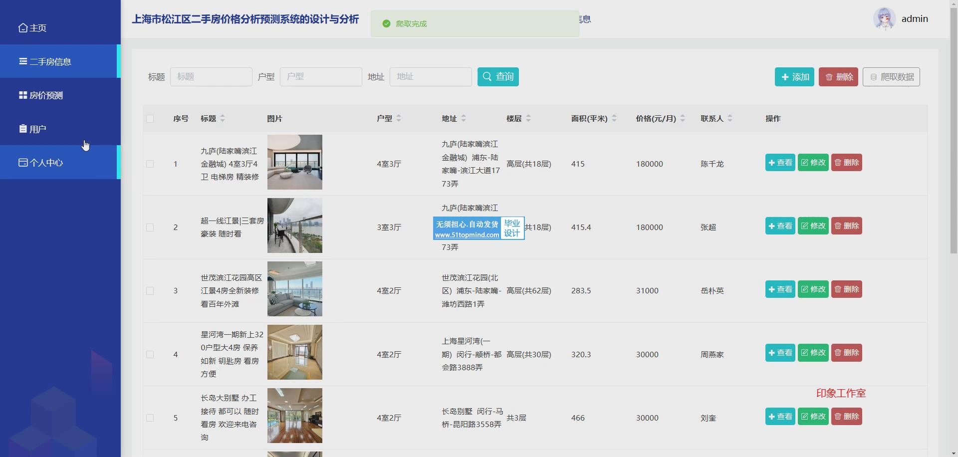 随着房地产市场和信息技术的发展,二手房交易行业逐渐兴起。传统二手房交易依赖线下中介,流程繁琐、信息不透明,购房者难以获取全面准确的价格信息,导致决策困难。为解决这些问题,本系统采用前端 Vue、后端 Django 和 MySQL 数据库开发。前端实现价格对比、可视化大图、二手房信息展示、房价预测和面积区间统计功能;后端负责二手房信息爬取、用户管理、信息修改、房价预测信息增加和大数据分析。系统通过技术手段优化二手房交易流程,为用户提供便捷高效的服务。