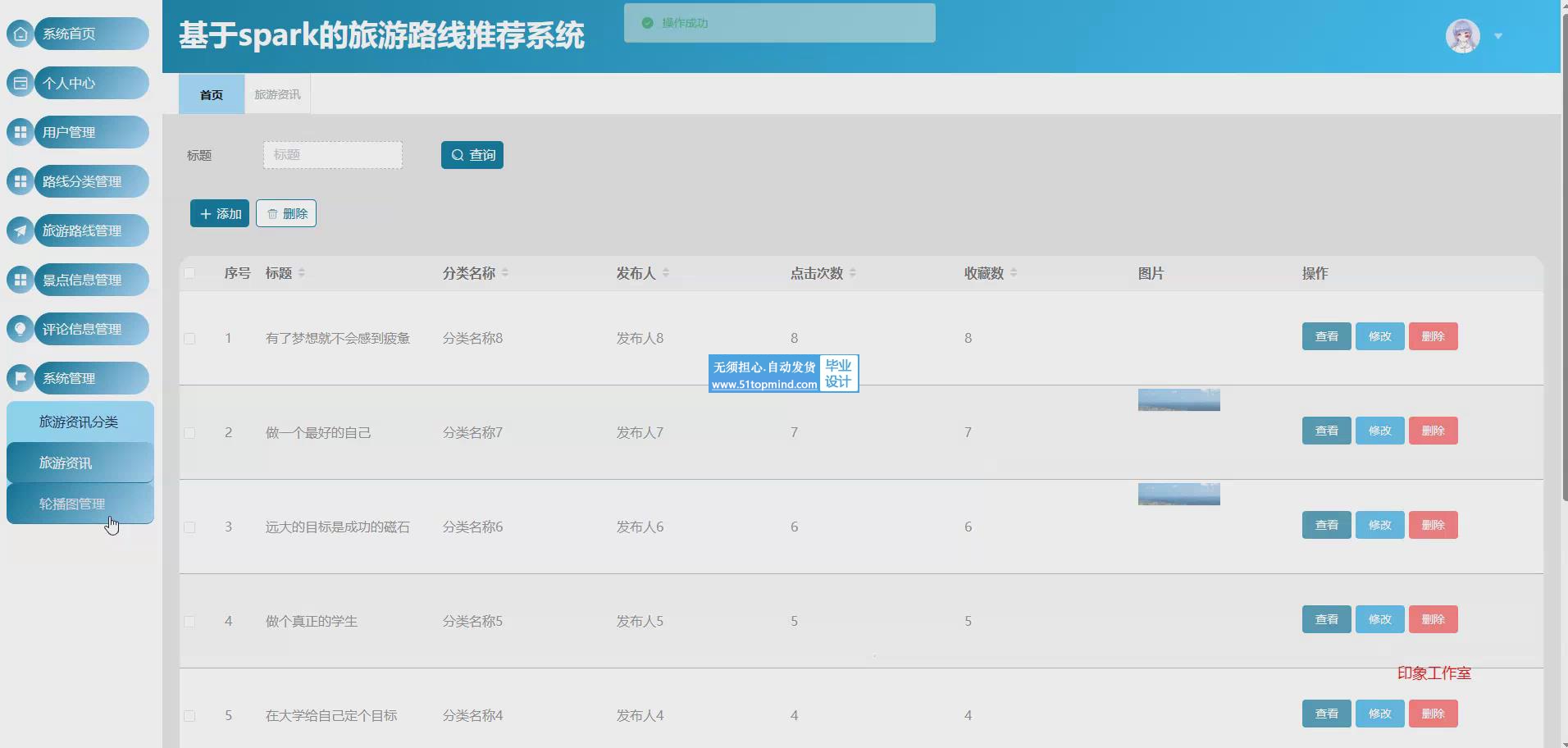 本系统基于Spark框架构建,主要面向旅游行业提供智能路线推荐服务。系统功能分为用户端和管理端两大模块:用户端支持浏览旅游资讯、查看路线和景点详情、阅读评论以及发布个性化路线;管理端提供可视化数据监控、用户账户管理、路线分类维护、多源数据采集及清洗等功能。系统通过Spark引擎处理海量旅游数据,运用推荐算法为用户提供个性化路线建议,同时确保数据处理的实时性和准确性。管理员可通过直观的数据看板掌握系统运行状况,并对各类数据进行有效管理。整个系统实现了从数据采集、处理到智能推荐的完整闭环,既满足了游客的个性化需求,又为管理者提供了高效的数据支持工具。