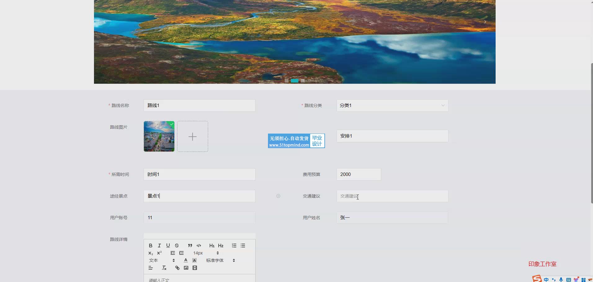 用户在系统中可以浏览最新的旅游资讯和热门旅游路线信息,以查看其他用户对景点和路线的评论内容,并能够自主发布个性化的旅游路线,分享旅行经验。