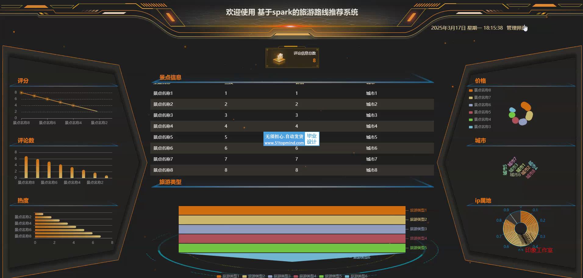 管理员通过可视化数据大屏实时监控系统运行状态和用户行为数据,维护旅游路线分类体系,确保分类准确性和完整性,从多个数据源自动爬取旅游相关数据,使用数据清洗模块对原始数据进行标准化处理,保证数据质量。