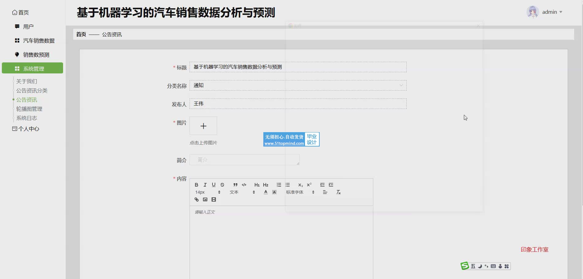 在本论文中,基于机器学习的汽车销售数据分析与预测系统被提出并实现。系统设计围绕着提高汽车销售数据管理效率,优化销售数据预测的准确性以及加强用户和管理员的互动性展开。论文首先从研究背景和意义入手,明确了在当今大数据与机器学习技术迅速发展的背景下,传统的汽车销售数据管理方式面临的挑战与局限。通过分析系统需求、系统架构及数据库设计,本论文展示了一个面向用户与管理员的完整汽车销售数据分析与预测平台。在用户端,系统支持查看汽车销售数据、公告资讯以及个人中心管理功能;管理员则可以通过系统进行销售数据的管理与修改、销售预测的查看与调整,以及公告资讯的发布与管理。系统整体基于Python语言开发,采用Django框架进行后端开发,前端使用Vue技术实现,数据存储则使用MySQL数据库,并通过机器学习算法进行销售数据的分析与预测。