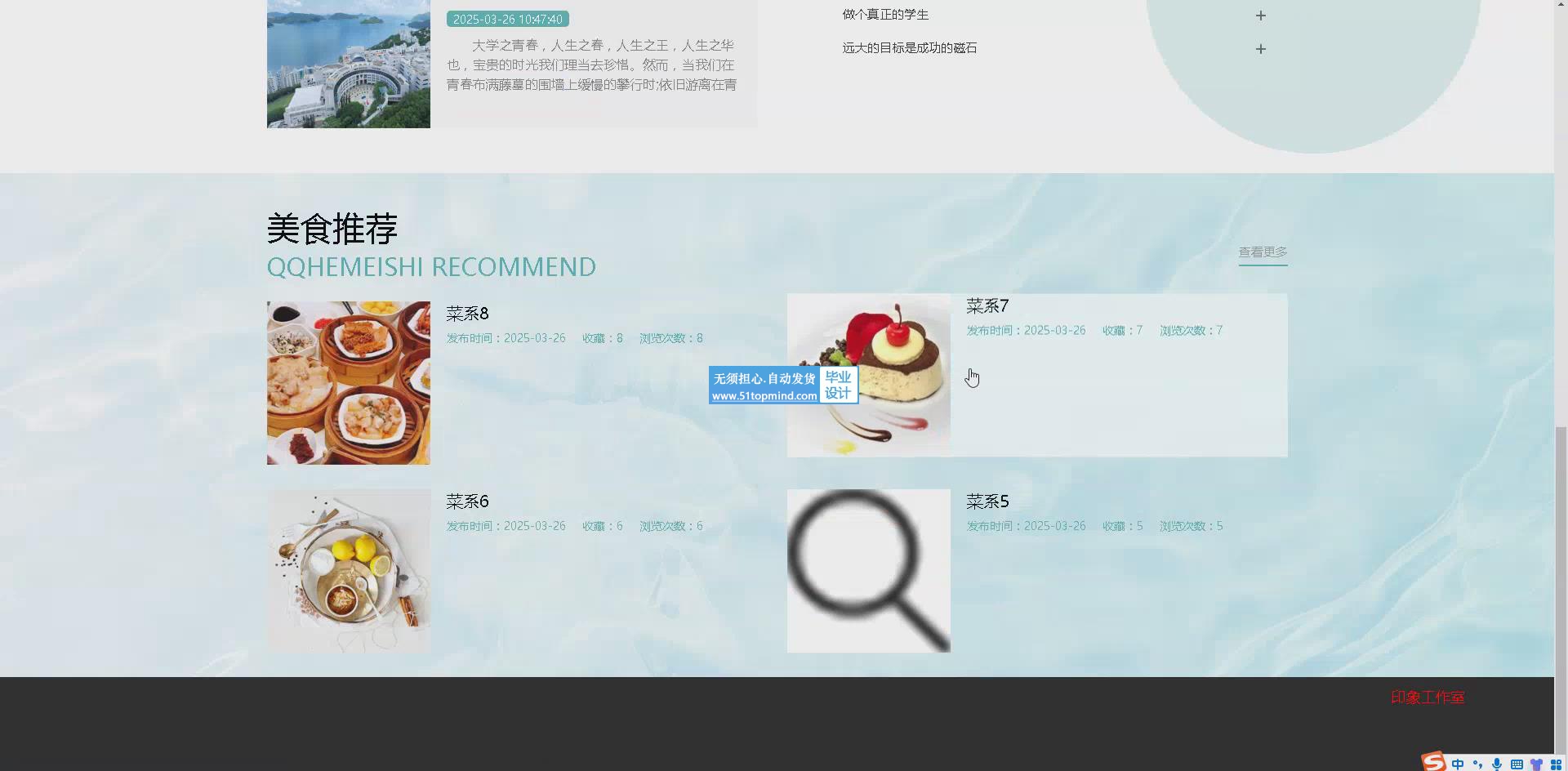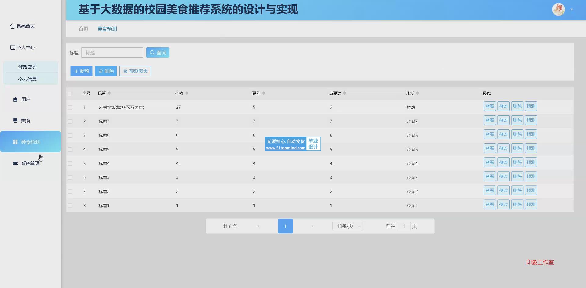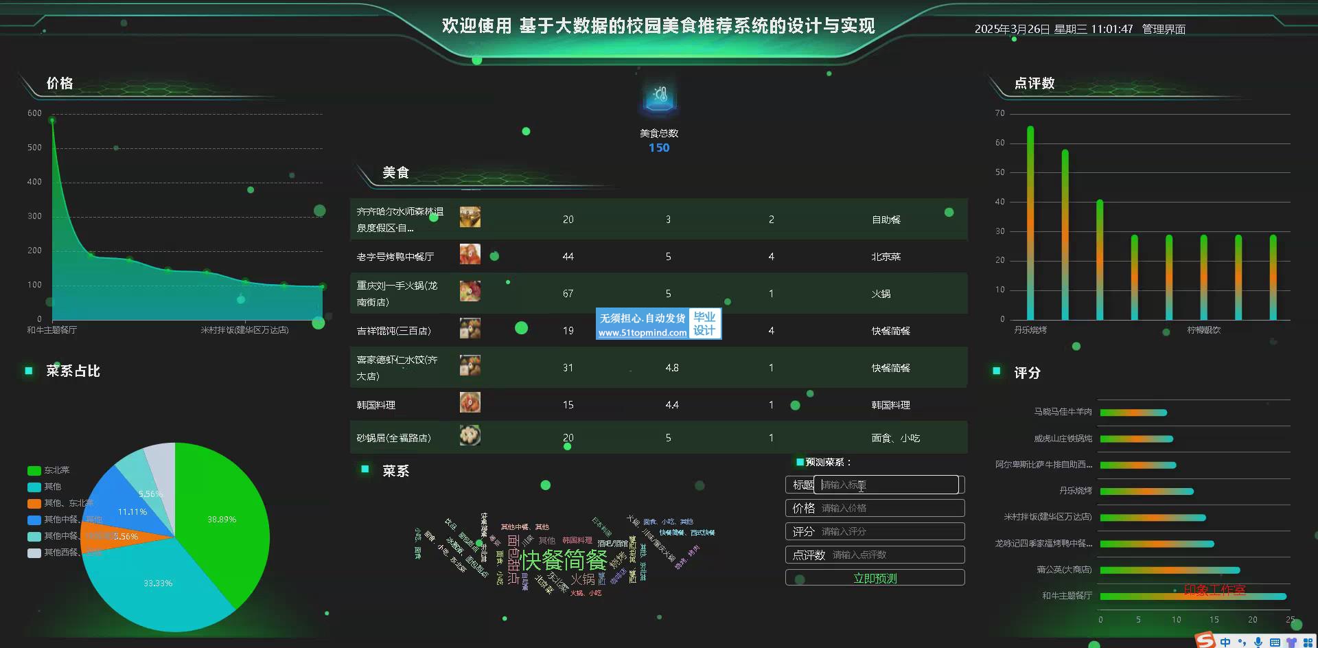 本文设计并实现了一个基于大数据的校园美食推荐系统。系统前端采用Vue框架开发,后端基于Django构建,数据库使用MySQL存储数据。系统分为用户端和管理端:用户端提供菜品浏览、公告查看、评价提交、注册登录等功能;管理端支持数据可视化、用户管理、菜品管理、菜系预测及数据爬取,通过数据分析优化餐饮服务效率。该系统提升了校园餐饮的信息化水平,为用户提供了更便捷的就餐体验。