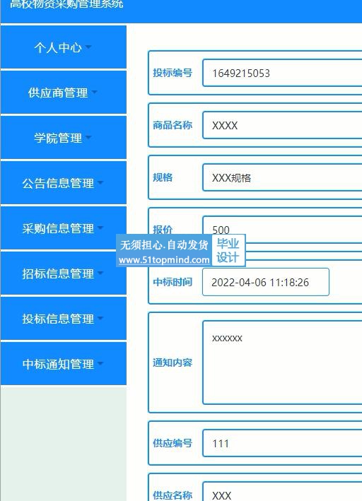 高校物资采购系统,基于java编程语言,ssm框架,mysql数据库和IDEA开发工具制作,本系统分为供应商,管理员,学院三个角色;其中供应商可以查看招标信息,在线投标,查看是否中标;学院可以添加采购信息;管理员对供应商,学院,公告,采购信息,招标信息,投标信息,中标信息等进行管理。本系统功能齐全,页面简洁,文档齐全,适合作为java毕业设计来参考和学习。