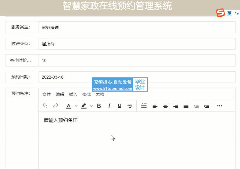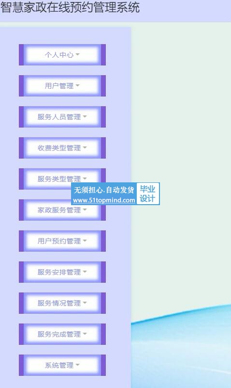 智慧家政在线预约管理系统为用户提供家政服务预约服务,系统包括前台和后台。