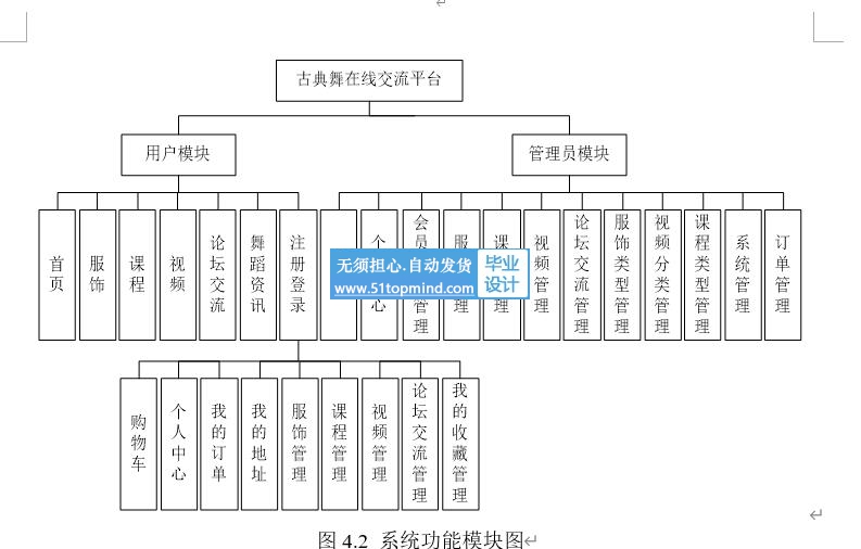 用户在系统前台可查看系统信息,包括首页、服务、课程、视频、论坛交流、舞蹈资讯等,用户要想实现发帖、服饰购买等操作,必须登录系统,没有账号的用户可进行注册操作,注册登录后主要功能模块包括个人中心、我的订单、我的地址、服饰管理、课程管理、视频管理、论坛交流管理以及我的收藏管理。用户用例图如图3.4所示。