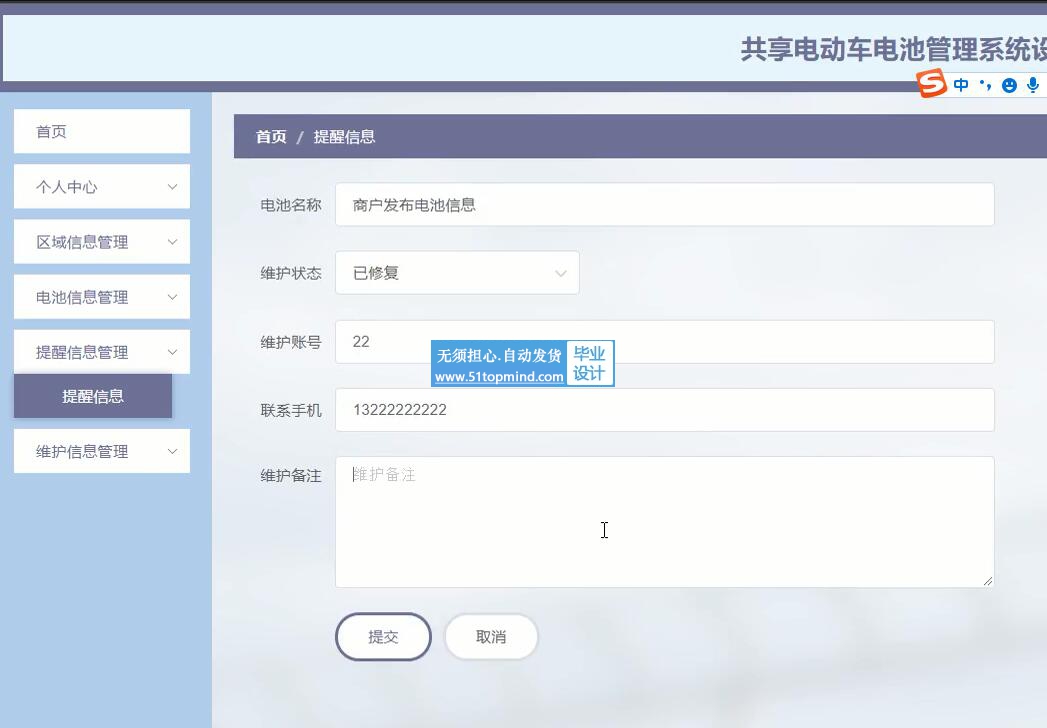 主要对首页、个人中心、用户管理、维护人员管理、商户管理、区域信息管理、电池信息管理、租赁订单管理、归还订单管理、费用订单管理、提醒信息管理、维护信息管理、系统管理的实现。