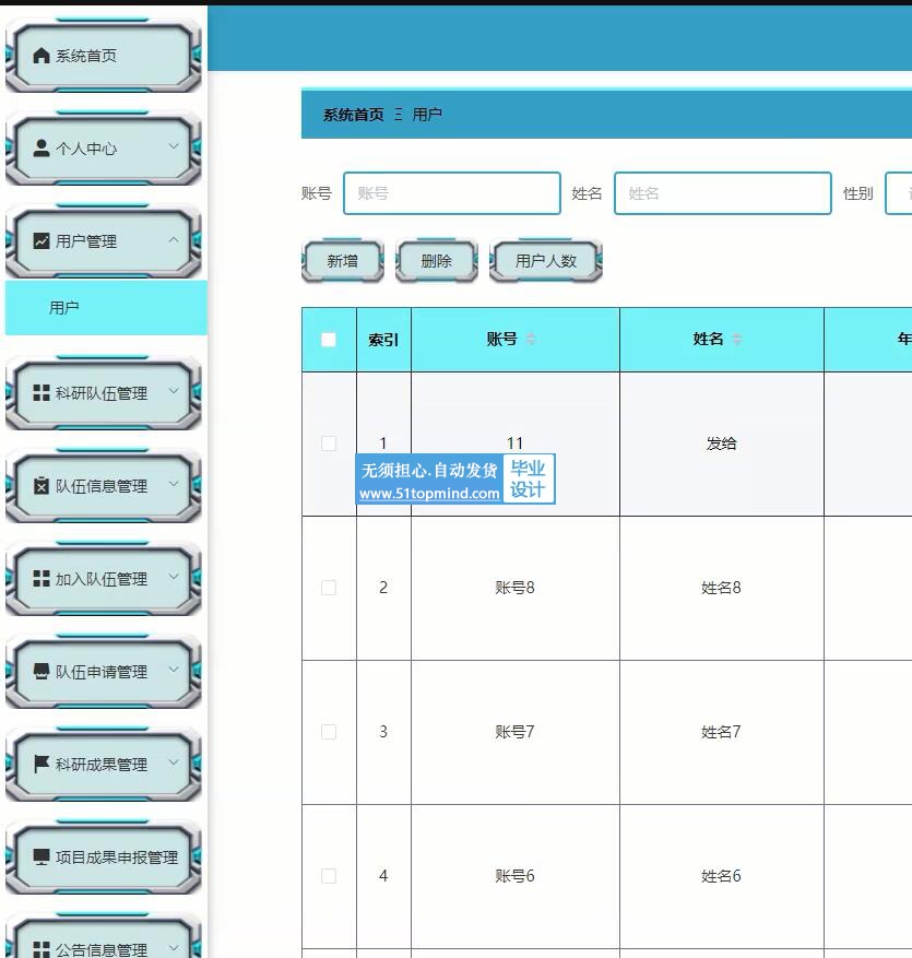 3.科研队伍管理:支持创建科研队伍,个人可以创建队伍后自己成为组长,组长拥有队员入伍的决定权,队员也可选择相应的科研队伍。