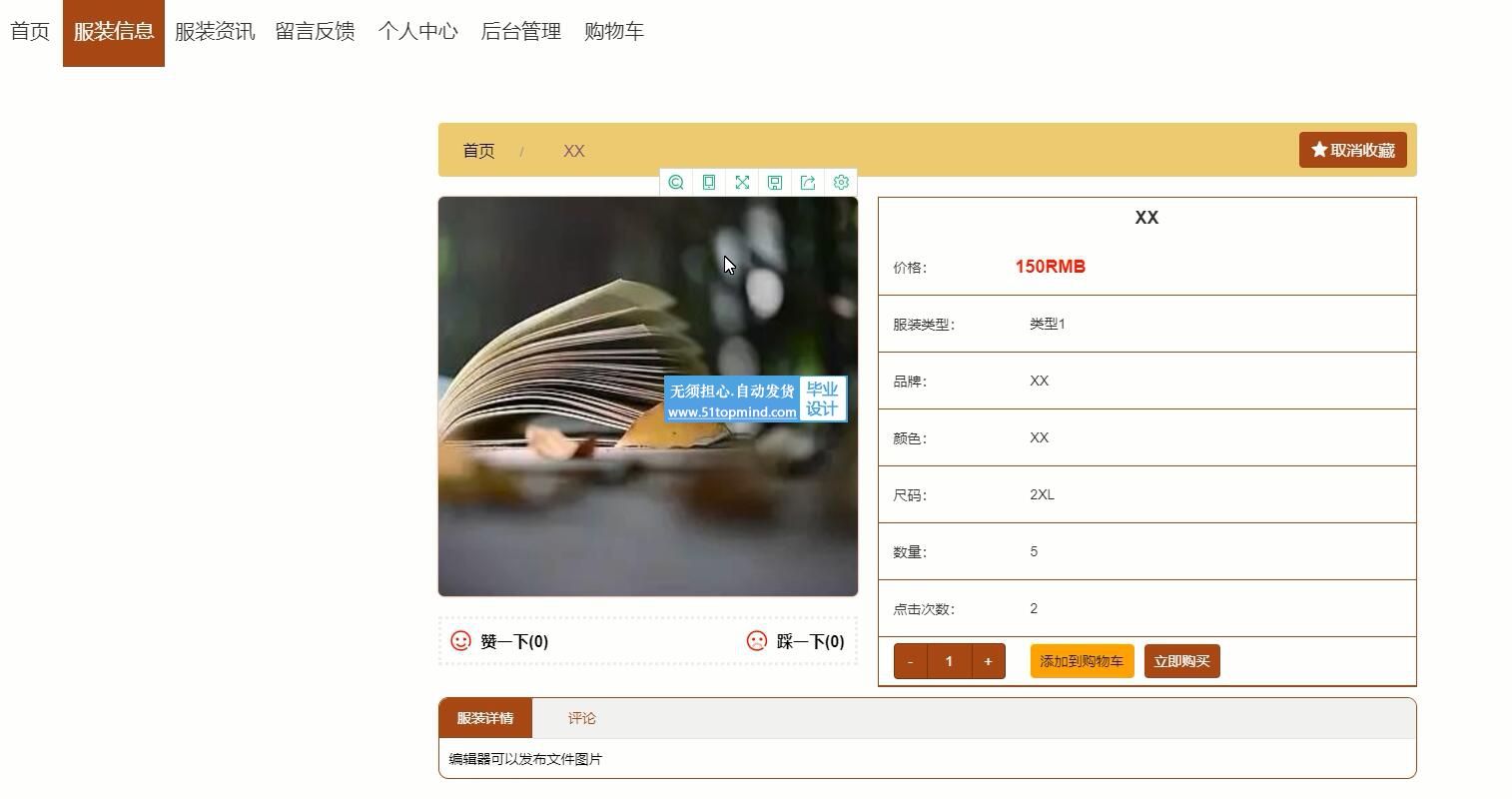 4.购物车功能:只有登录后的会员才可以使用购物车,可以向购物车中添加服装,也可以删除购物车中的服装。