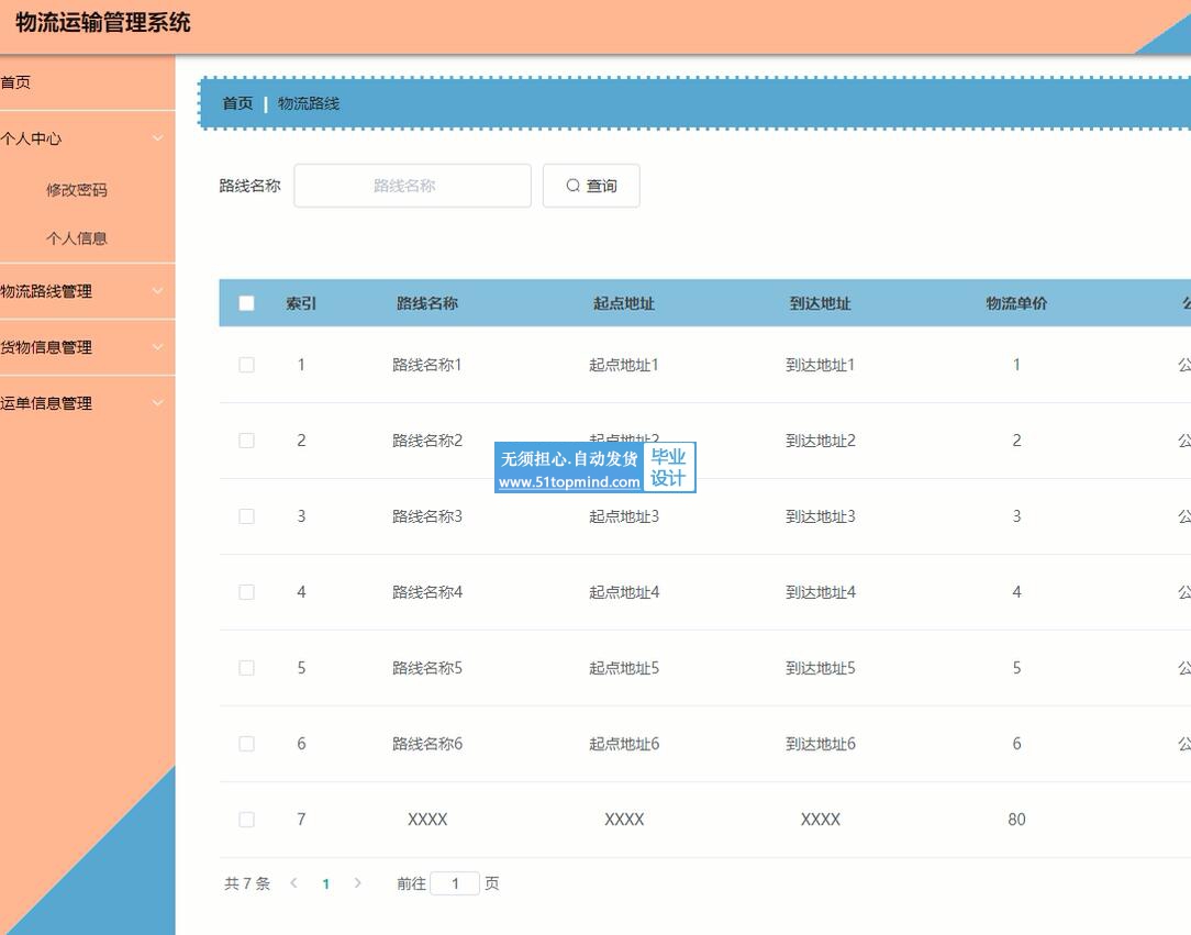 用户功能:用户进入系统可以实现首页、个人中心、物流路线管理、货物信息管理、运单信息管理等功能进行操作