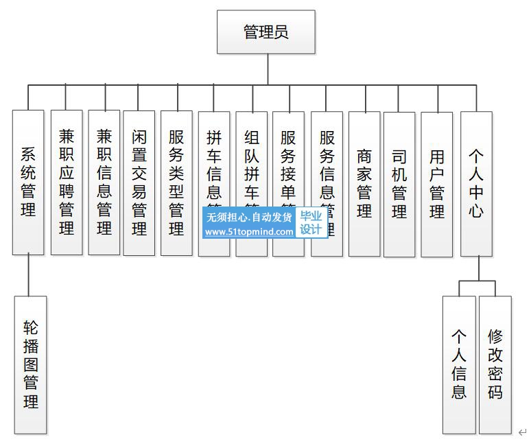 图3.5即为管理员用例图,管理员权限操作的功能包括用户管理,司机管理,商家管理,服务信息管理,服务接单管理,组队拼车管理,拼车信息管理,服务类型管理,闲置交易管理,兼职信息管理,兼职应聘管理等