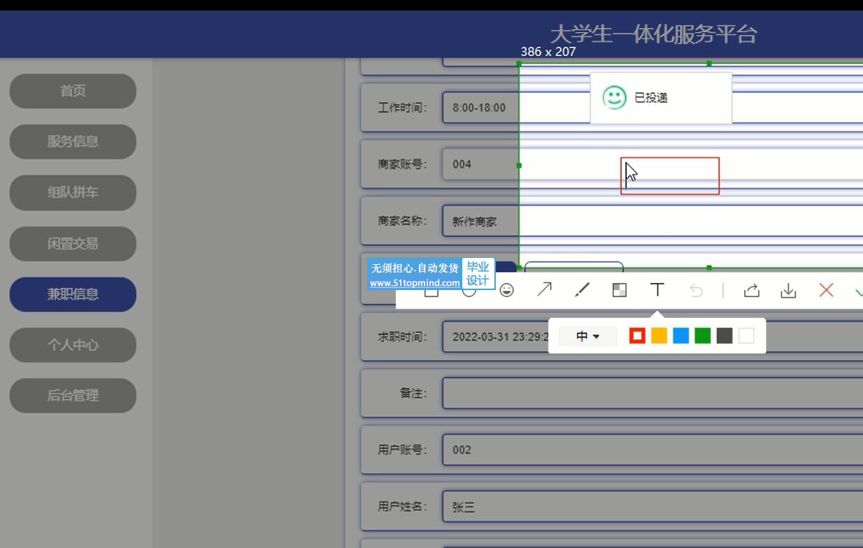 大学生一体化服务平台可以实现的功能包括用户管理,司机管理,商家管理,服务信息管理,服务接单管理,组队拼车管理,拼车信息管理,服务类型管理,闲置交易管理,兼职信息管理,兼职应聘管理等。该系统采用了Mysql数据库,java语言,vue框架等技术进行编程实现。