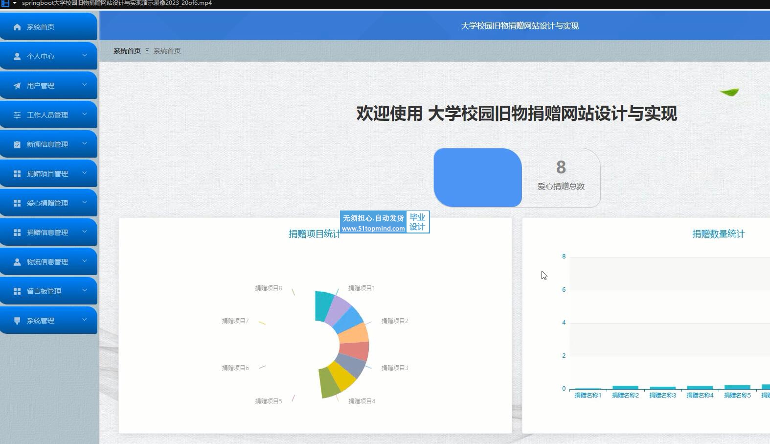 本文通过采用B/S架构、MySQL数据库以及java语言、springboot框架,结合国内线上管理现状,开发了一个基于springboot的大学校园旧物捐赠网站。系统分为多个功能模块:用户信息、工作人员信息、新闻信息、捐赠项目、爱心捐赠、捐赠信息、物流信息等。通过系统测试,本系统实现了系统设计目标,相对于人工管理方式,本系统有效的减少了学校的经济投入,并且大幅度提升了大学校园旧物捐赠管理的效率。