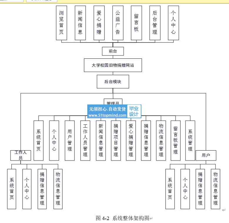 大学校园旧物捐赠网站主要有管理员和用户、工作人员,三个功能模块:管理员模块、用户模块、工作人员模块。以下将对这三个功能的作用进行详细的剖析[11]。