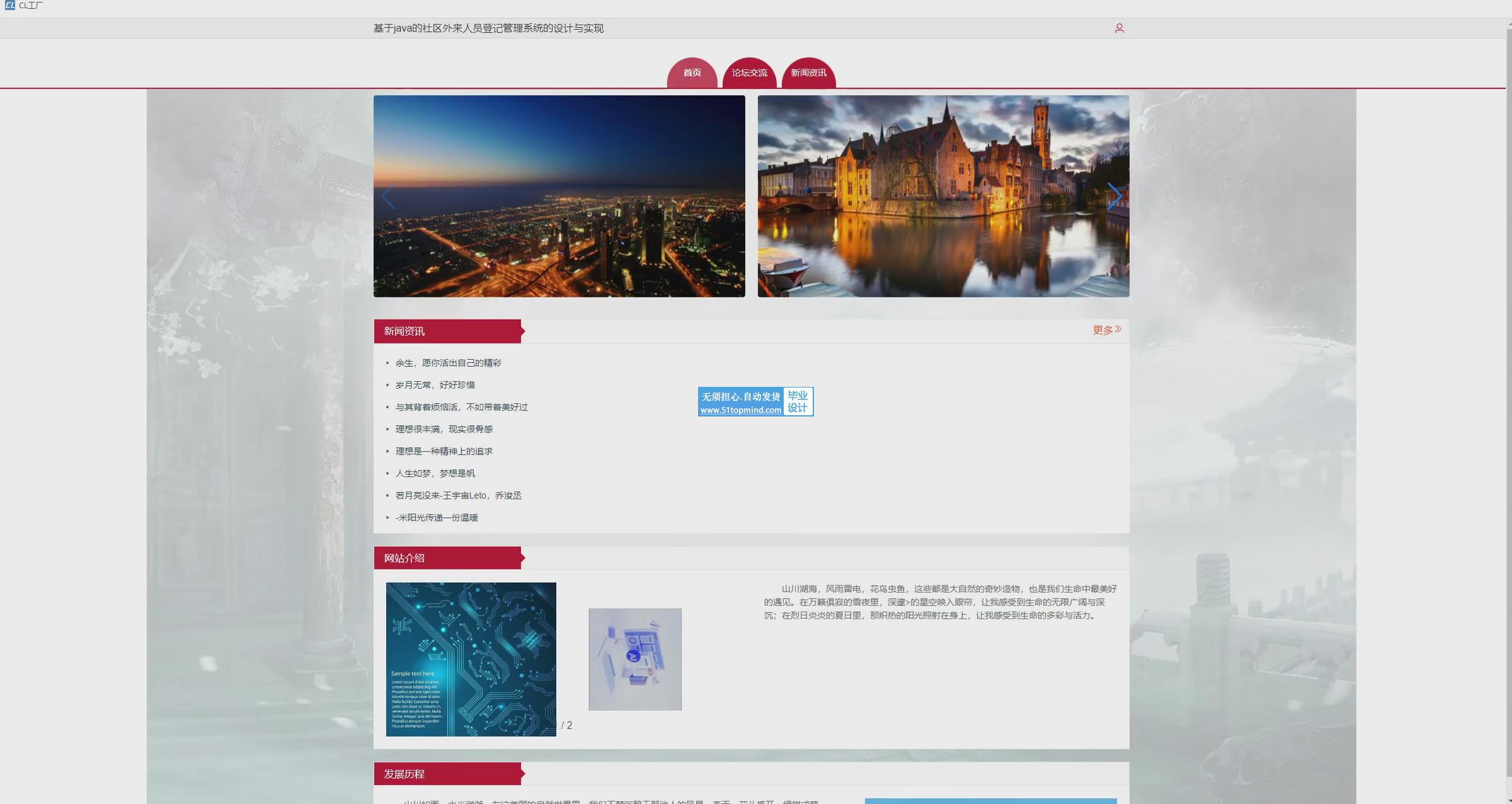 社区外来人员登记管理系统的设计内容包含前端开发、后端开发和数据库设计,使用Vue.js作为前端框架,Spring Boot作为后端框架,MySQL作为数据库管理系统。后端开发部分中Spring负责管理对象的生命周期,提供依赖注入和事务管理等功能。SpringMVC负责处理前端请求,将请求转发到相应的处理方法,并返回结果给前端。MyBatis则负责数据库操作,通过映射文件实现SQL与Java对象之间的映射关系。社区外来人员登记管理系统的功能模块包括用户管理、来访管理、黑名单管理、新闻资讯管理、论坛管理等功能。这些模块覆盖了社区外来人员登记信息的采集、编辑、发布、管理和搜索等方面,为用户提供了一个便捷、高效的社区外来人员登记管理平台。