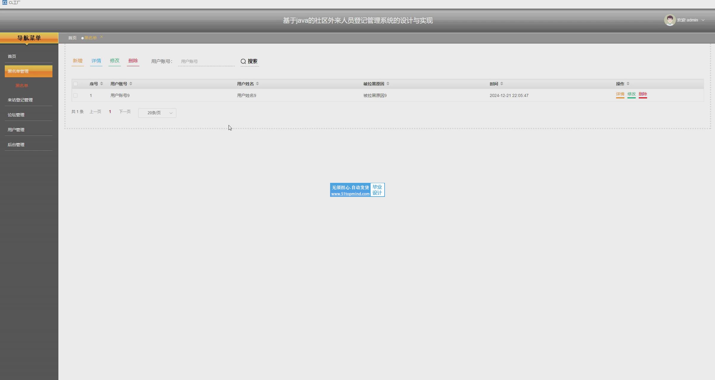 黑名单管理模块允许管理员对来访者进行拉黑操作,以限制其进入社区或访问某些功能。支持管理员添加新的黑名单记录、修改已拉黑的来访者信息、删除不再需要的黑名单记录等操作。管理员可以根据来访者的行为或历史记录,将其列入黑名单,并设置相应的拉黑期限和原因。