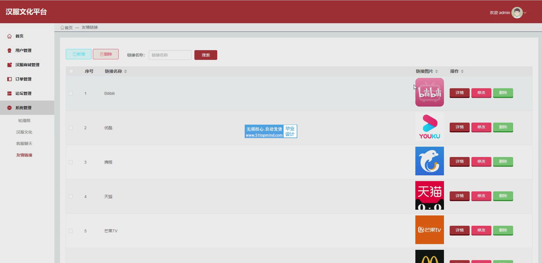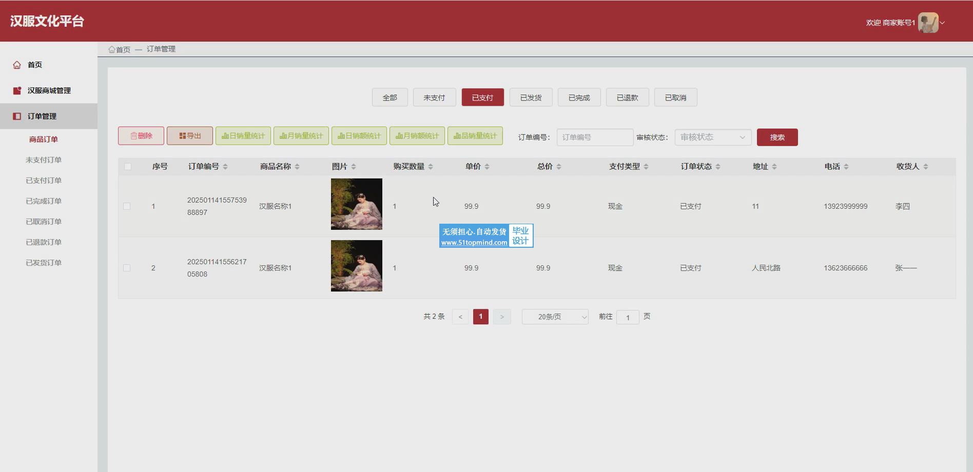 系统管理员负责整体平台的管理,包括用户权限分配、商品信息审核、订单管理、论坛内容监管等。普通用户可以浏览商品、购买汉服、查看汉服文化资料、参与论坛互动以及评价商品;商家则可以通过后台管理界面发布和管理商品、查看订单、处理售后问题。通过角色权限的划分,每个用户都能在其权限范围内享受相应的功能,保证平台操作的安全性与流畅性。最后,经过测试与优化,本系统具备良好的稳定性和可扩展性,可以支持日益增长的用户和数据需求。
