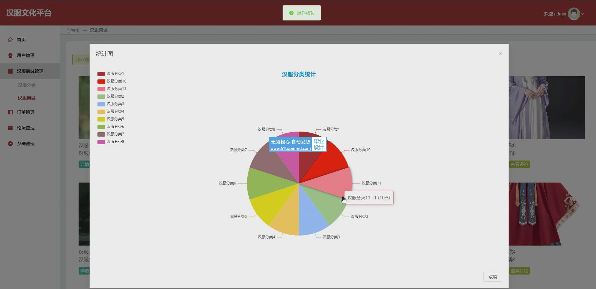 本研究主要围绕汉服文化平台的开发与实现展开,系统集成了汉服商品展示、购物车、订单管理、用户管理、留言管理、数据统计等功能,同时融入汉服文化知识传播,以提升用户体验和文化认同。平台采用前后端分离架构,后端使用SpringBoot框架,前端基于Vue框架,数据库采用MySQL存储各类数据。