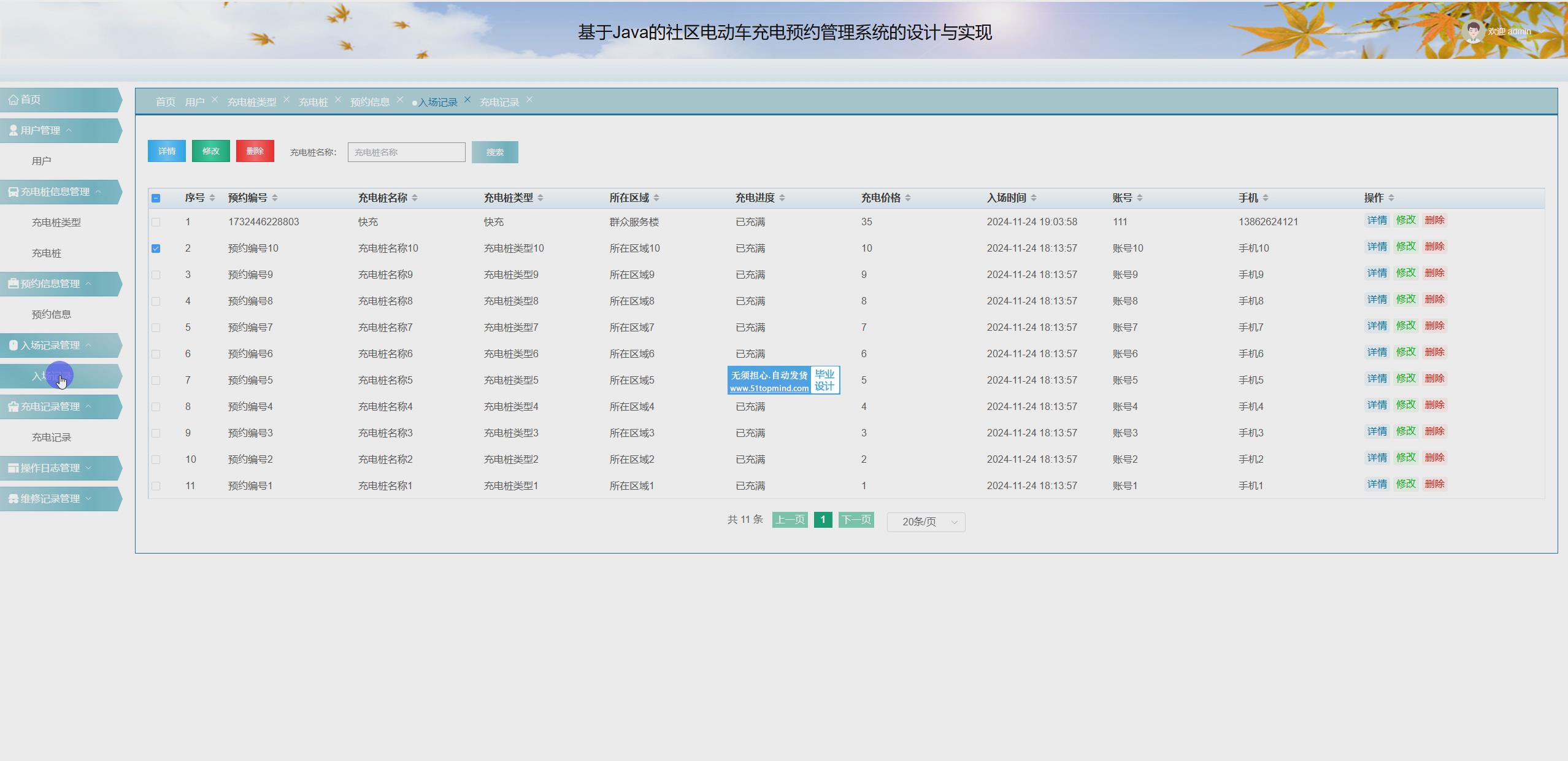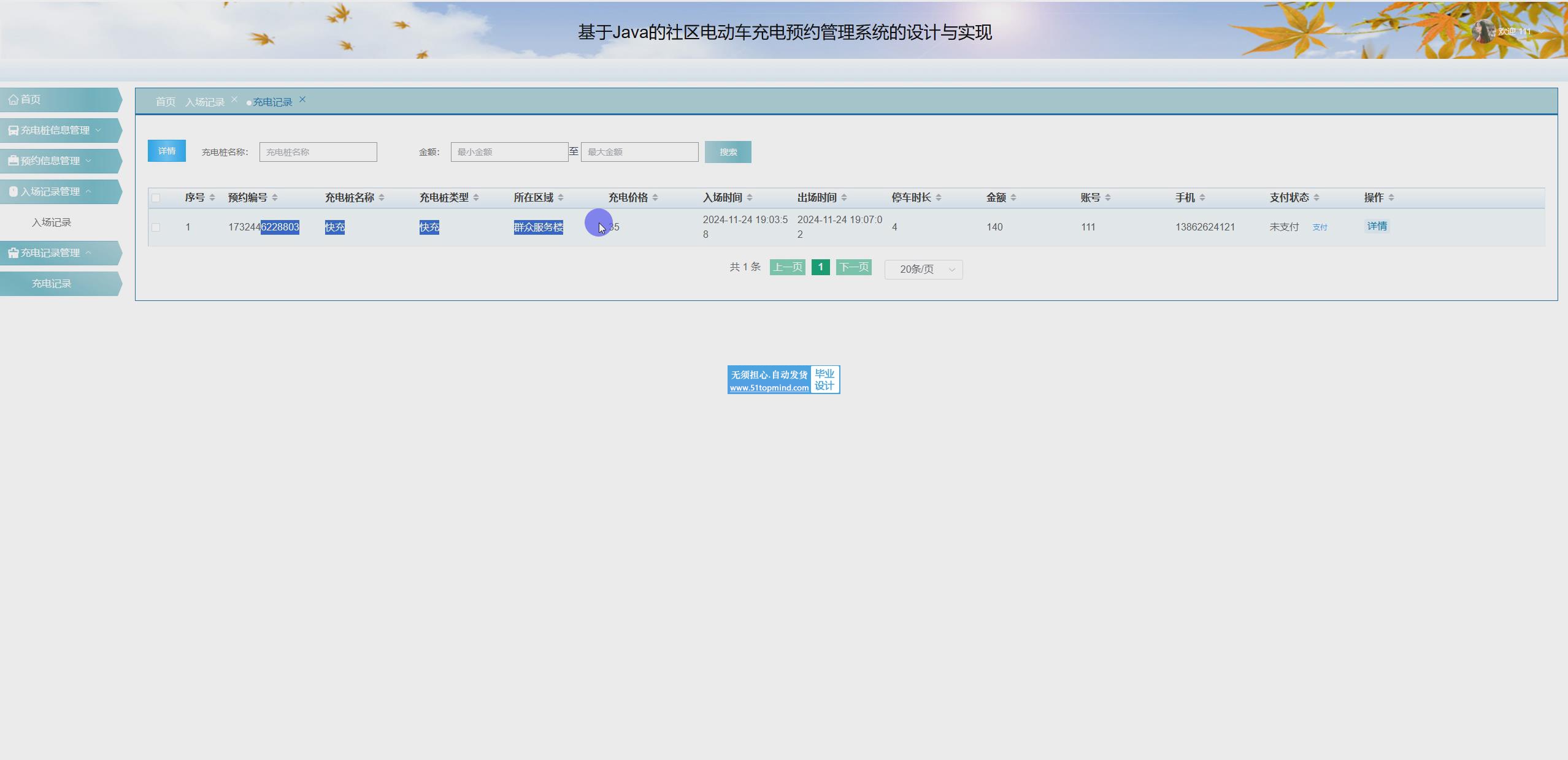 社区电动车充电预约管理系统主要功能模块包括用户管理、充电桩管理、预约管理、入场管理、充电记录管理、维修管理,采取面对对象的开发模式进行软件的开发和硬体的架设,能很好的满足实际使用的需求,完善了对应的软体架设以及程序编码的工作,采取MySQL作为后台数据的主要存储单元,采用Spring Boot框架、Vue.js框架、Ajax技术进行业务系统的编码及其开发,实现了本系统的全部功能。本次报告,首先分析了研究的背景、作用、意义,为研究工作的合理性打下了基础。针对社区电动车充电预约管理系统的各项需求以及技术问题进行分析,证明了系统的必要性和技术可行性,然后对设计系统需要使用的技术软件以及设计思想做了基本的介绍,最后来实现社区电动车充电预约管理系统和部署运行使用它。