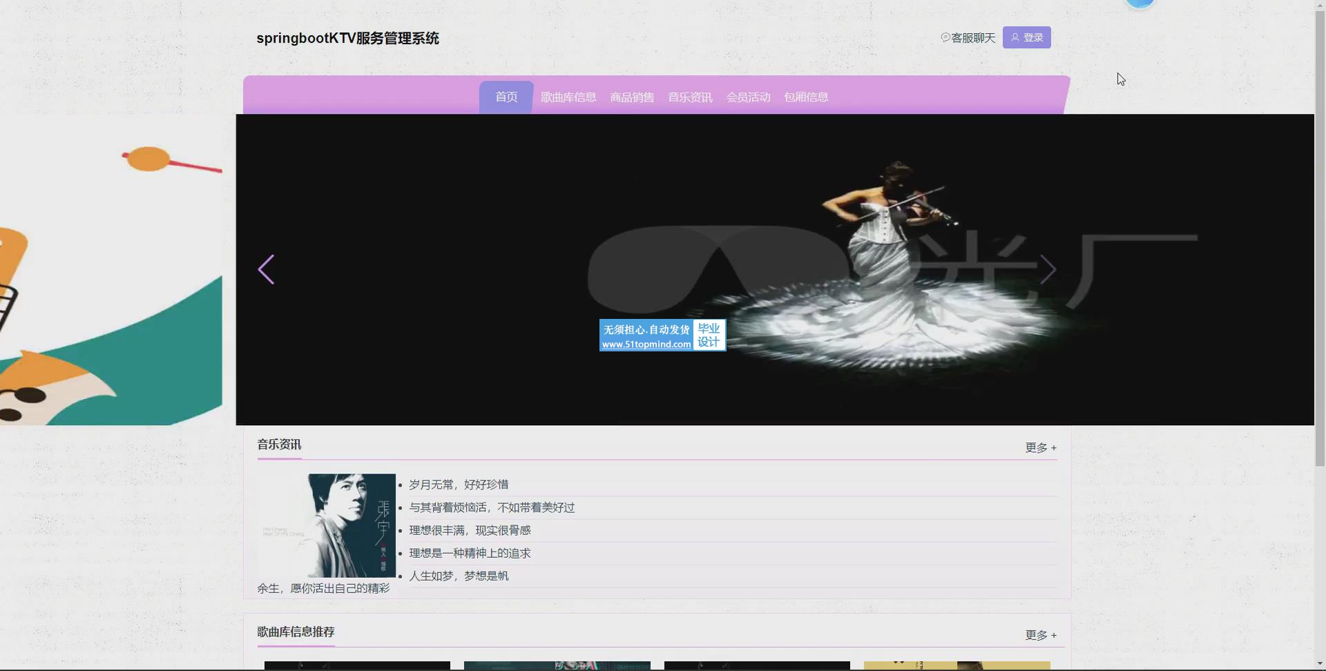 KTV服务管理系统分为两个功能角色,用户和管理员。用户主要功能有:首页、歌曲库信息、商品销售、音乐资讯、会员活动、包厢信息、客服聊天、个人中心等