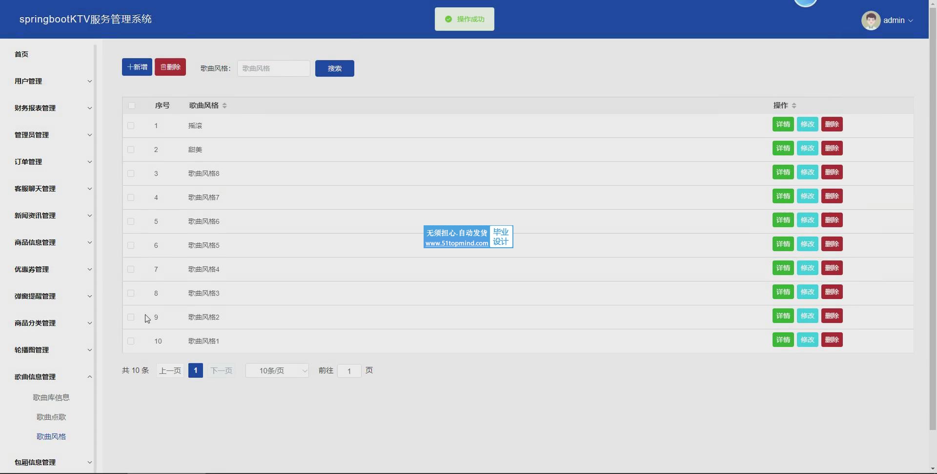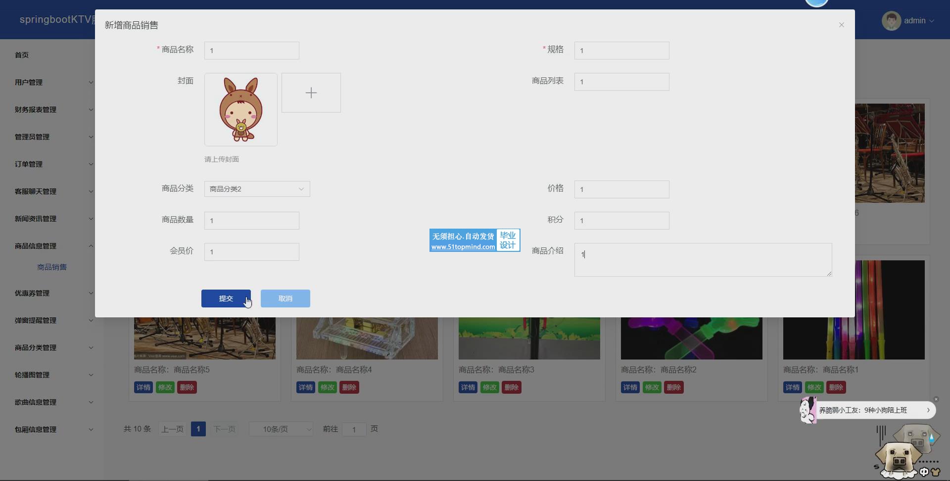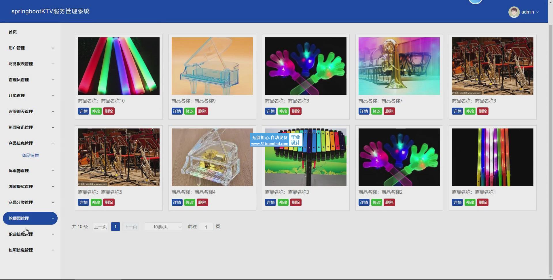 管理员主要功能有:首页、用户管理、财务报表管理、管理员管理、订单管理、客服聊天管理、新闻资讯管理、商品信息管理、优惠券管理、弹窗提醒管理、商品分类管理、轮播图管理、歌曲信息管理、包厢信息管理、个人中心等