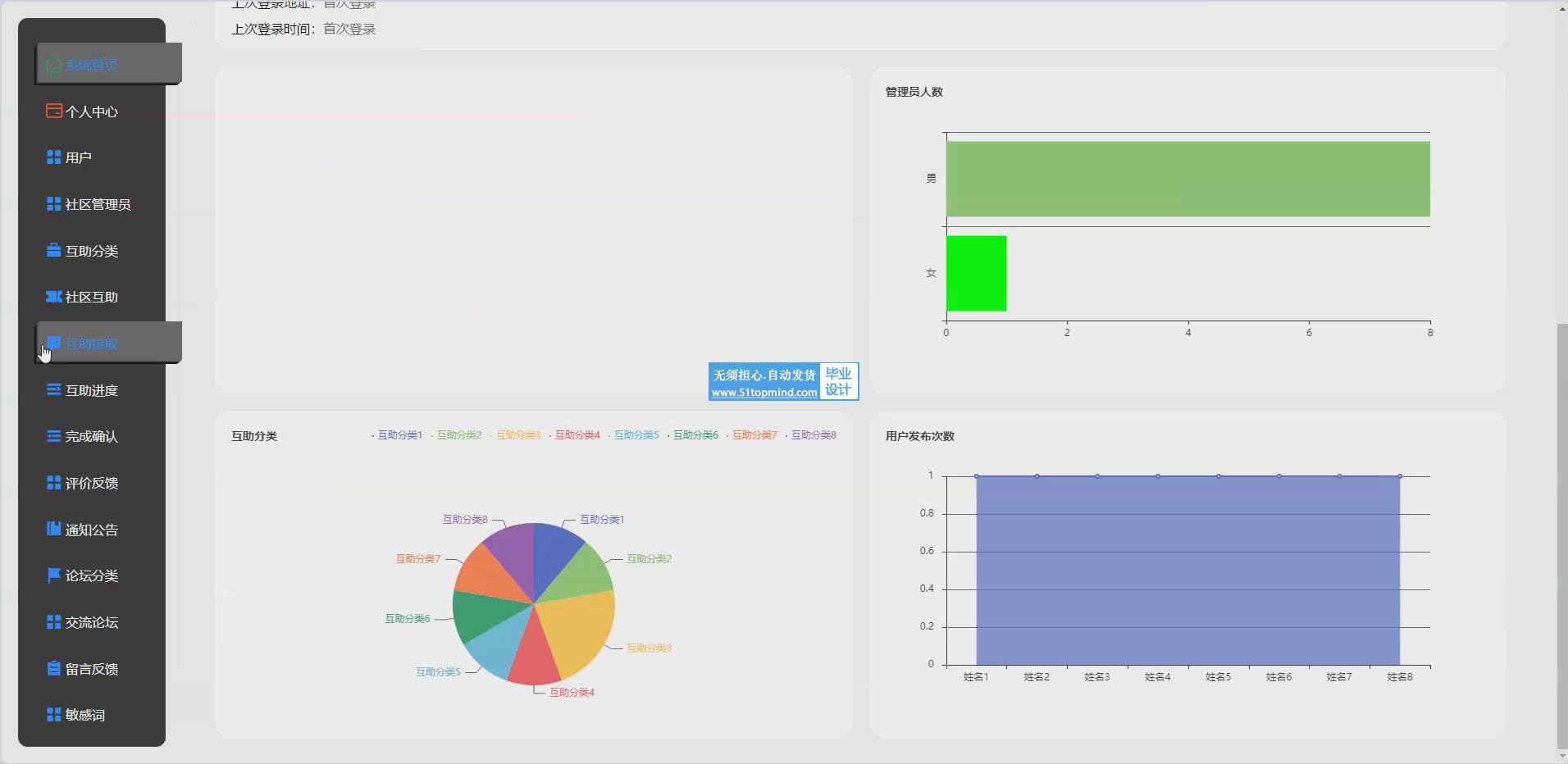 本系统主要分为三个子系统,分别是用户、社区管理员和管理员。用户内含:社区互助、交流论坛、留言反馈等功能。社区管理员包括;社区互助、互助接取、互助进度、完成确认、评价反馈、通知公告等功能。管理员包括:用户、社区管理员、互助分类、社区互助、互助接取、互助进度、完成确认、评价反馈等功能。