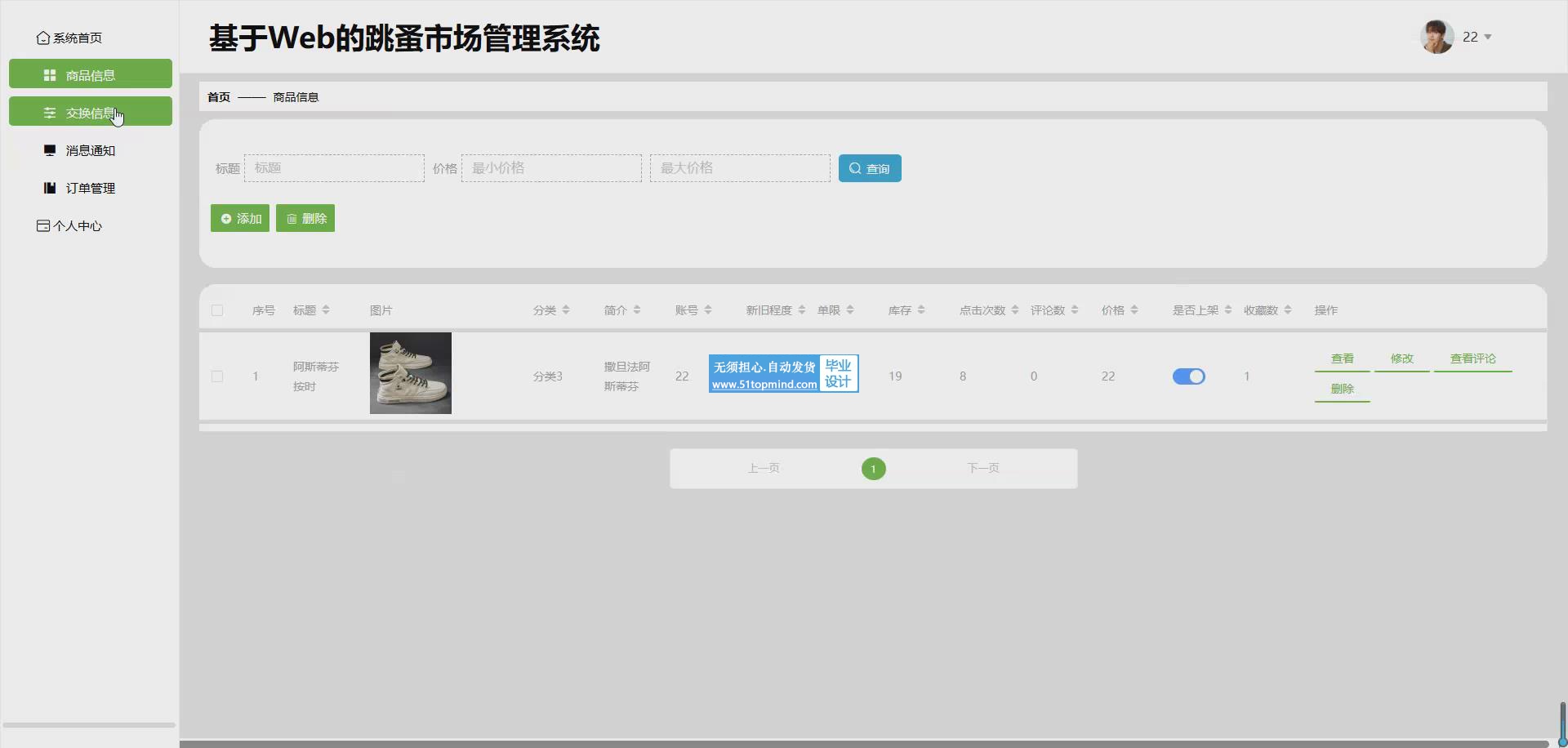 本课题主要目的是采用Web技术设计一个跳蚤市场交易系统,实现对用户及商品信息的统一管理。通过运用Web技术,能够实现高效的系统开发,为用户提供可靠、便捷的交易平台,方便他们分享物品使用心得、讨论商品使用价值、结识志同道合的朋友。这不仅有助于提升用户的海淘体验,还能推动跳蚤市场的发展和资源利用,因此基于 Web的跳蚤市场管理系统的设计与实现具有重要的现实意义。前端用户可以进行注册登录、用户信息管理和二手商品信息发布,后台管理员可以进行登录、用户管理、商品订单管理和数据分析。针对跳蚤市场交易遇到的商品信息发布过时和交易信息发布不规范的问题,添加了用户修改商品的信息和用户与用户之间商品信息的交流功能。最后对系统进行测试,优化完善系统。通过简单直观的界面设置,满足不同的用户需求。具体来说,本课题的目的包括以下几个方面: