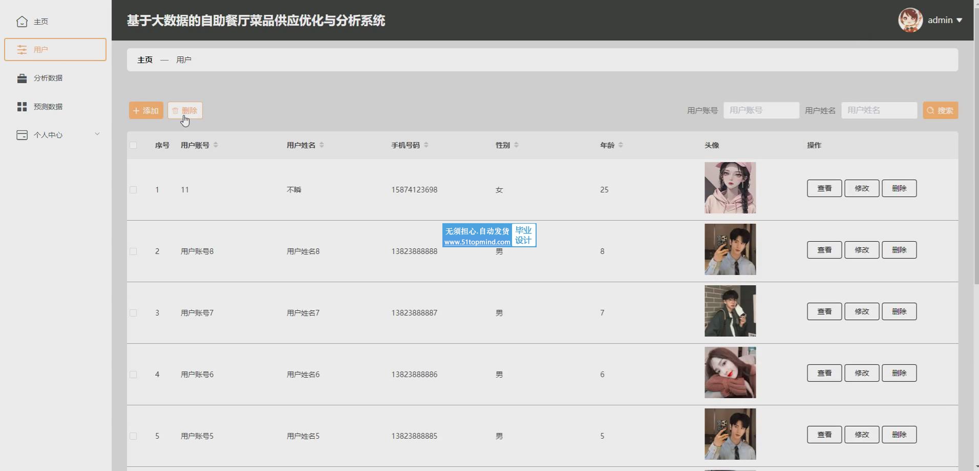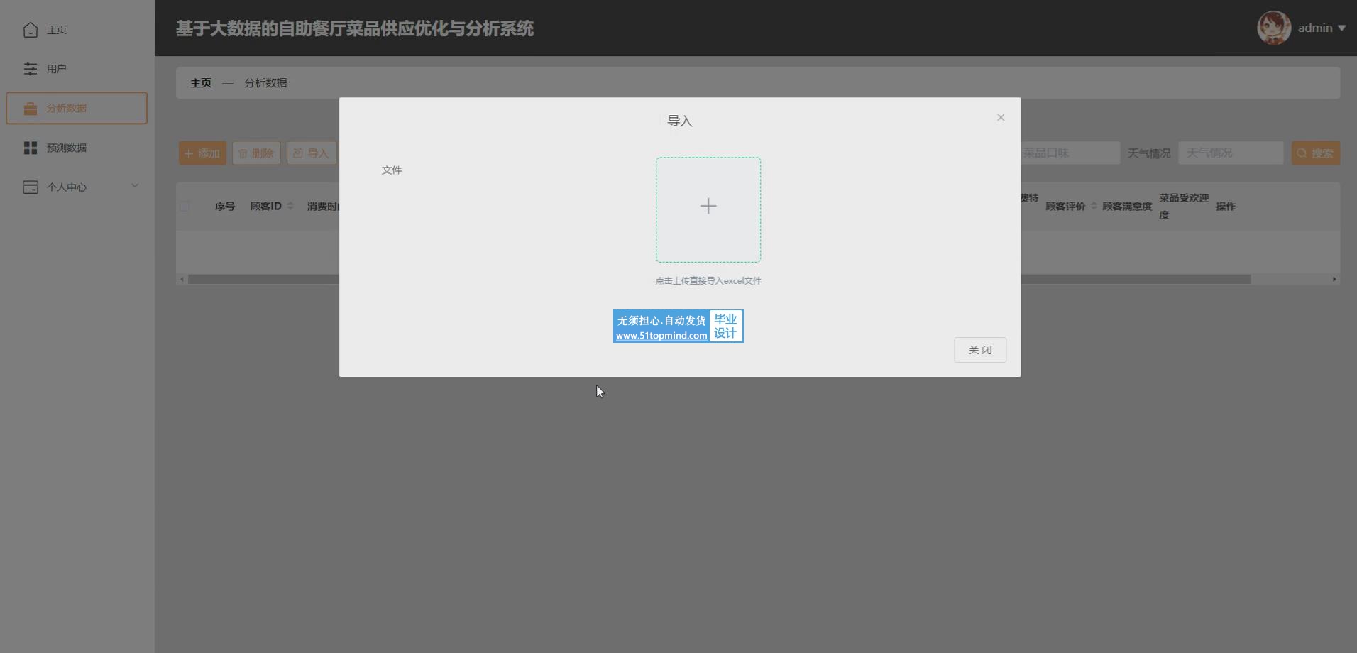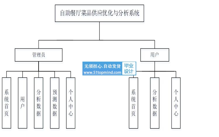 自助餐厅菜品供应优化与分析系统是基于Web服务模式,采用面向对象的程序设计方法,实现一个具有通用功能的模型结构。使用该系统的条件仅是需要具备连上互联网的能力,并能够通过移动设备登录系统。系统用户分管理员和用户。管理员可操作系统首页、管理用户、分析及预测数据、访问个人中心;用户能浏览系统首页、分析数据,使用个人中心功能。
