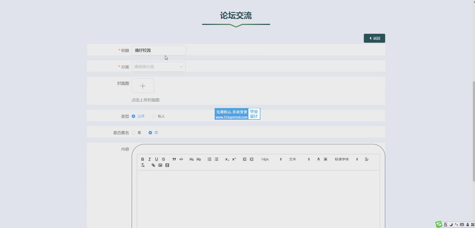 关键词:校园论坛交流系统;springboot框架;JAVA语言;