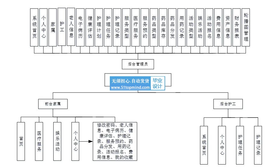 本系统采用Java语言结合Spring Boot框架进行开发,并利用MySQL数据库作为后台存储解决方案。整个系统被划分为三大核心模块:管理员模块、家属和护工模块。本文首先深入分析了养老院管理的业务流程,并据此明确了其功能性需求,进而设计了一个涵盖管理员、家属和护工三大角色的养老院管理系统。家属能够通过该系统浏览医疗服务、娱乐活动等;护工能够通过该系统浏览护理任务、护理记录等;而管理员则可通过专属的后台管理界面执行用户信息管理等一系列操作[7]。