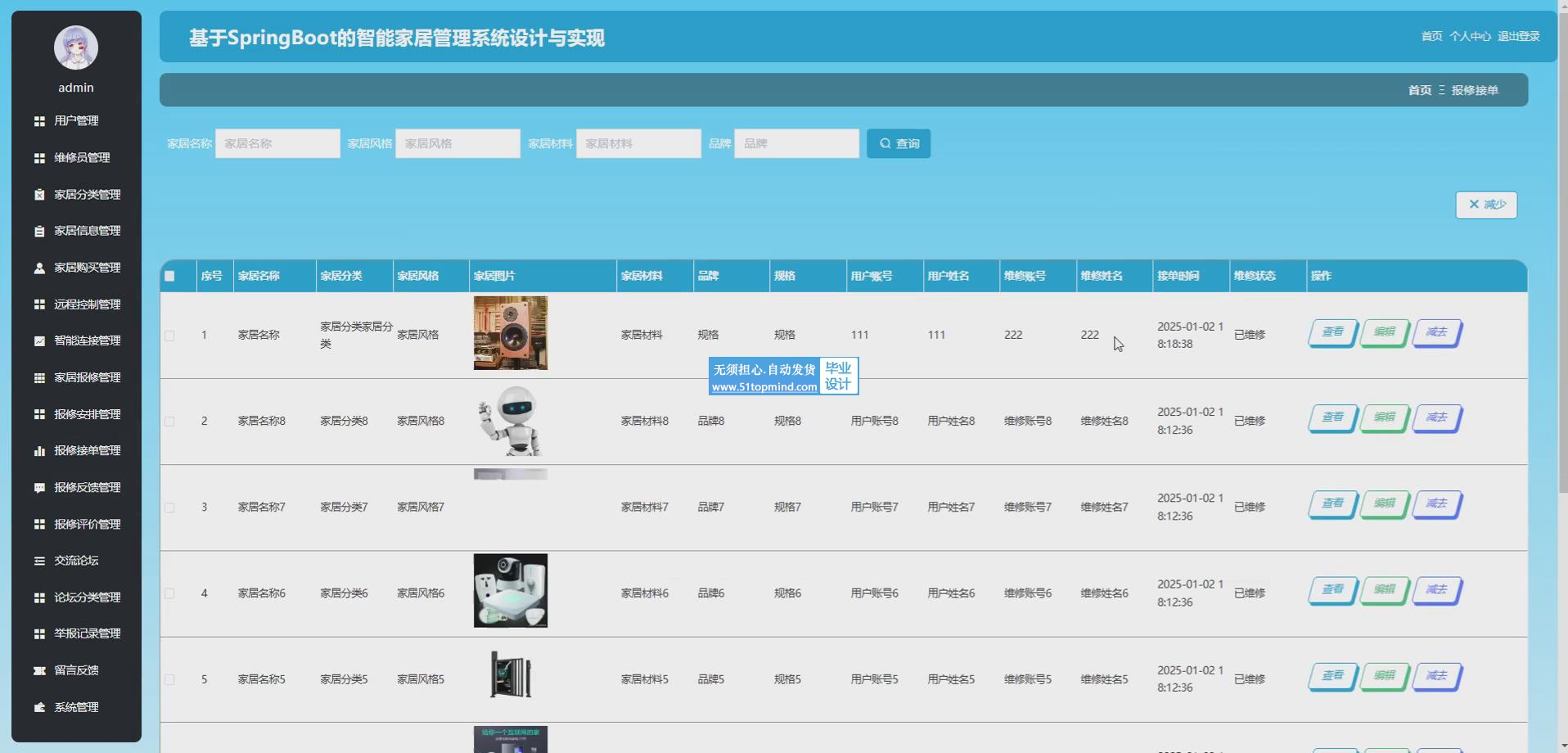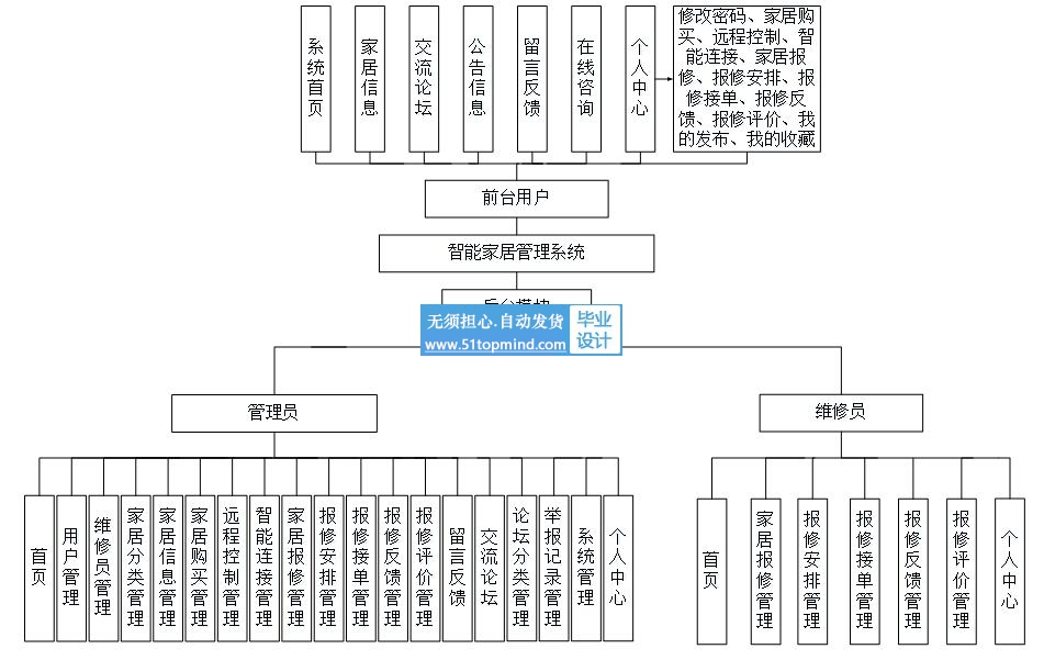 管理员可以在系统上实现对家居信息管理、家居购买管理、远程控制管理、智能连接管理、家居报修管理、报修安排管理、报修接单管理、报修反馈管理、报修评价管理等的增删改查操作等。