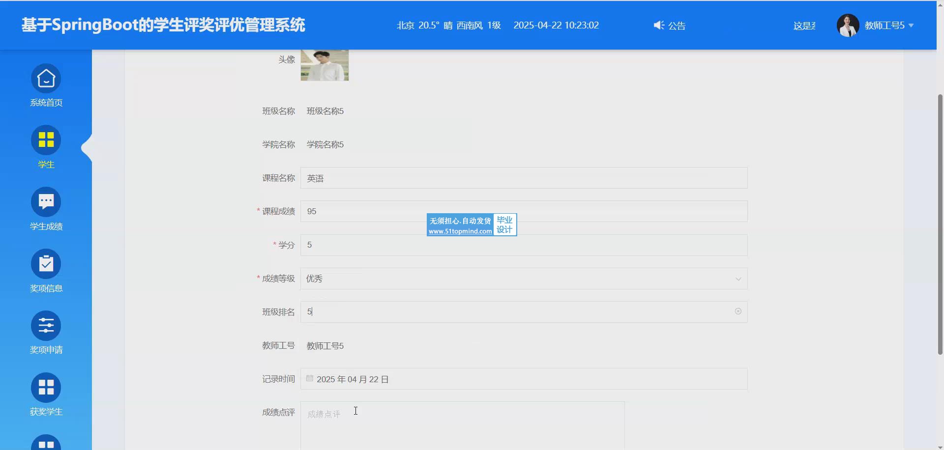 通过查阅资料,明确了学生评优评奖管理的主要流程,提出了系统需包含奖项信息管理、学生成绩录入、奖项申请及审核、公示异议反馈等核心功能模块。在系统设计过程中,结合实际业务逻辑,绘制了系统用例图、流程图、时序图等,为后续开发提供了清晰的技术路线。后端采用SpringBoot框架搭建,数据库使用MySQL进行数据存储,前后端通过接口交互,提升了系统整体的可维护性和响应效率。本人分别完成了管理员、学生和教师三种角色功能模块的开发,包括用户登录、数据管理、信息查询与操作等内容,确保系统各类用户的功能需求得到满足。数据库设计,针对不同模块的数据存储需求,合理规划并创建了奖项信息、学生成绩、教师信息、好人好事记录等多个数据表,确保系统在数据管理方面的完整性和规范性。系统开发完成后,通过黑盒测试的方法对主要功能进行了多轮测试,系统运行稳定,功能基本符合预期目标。