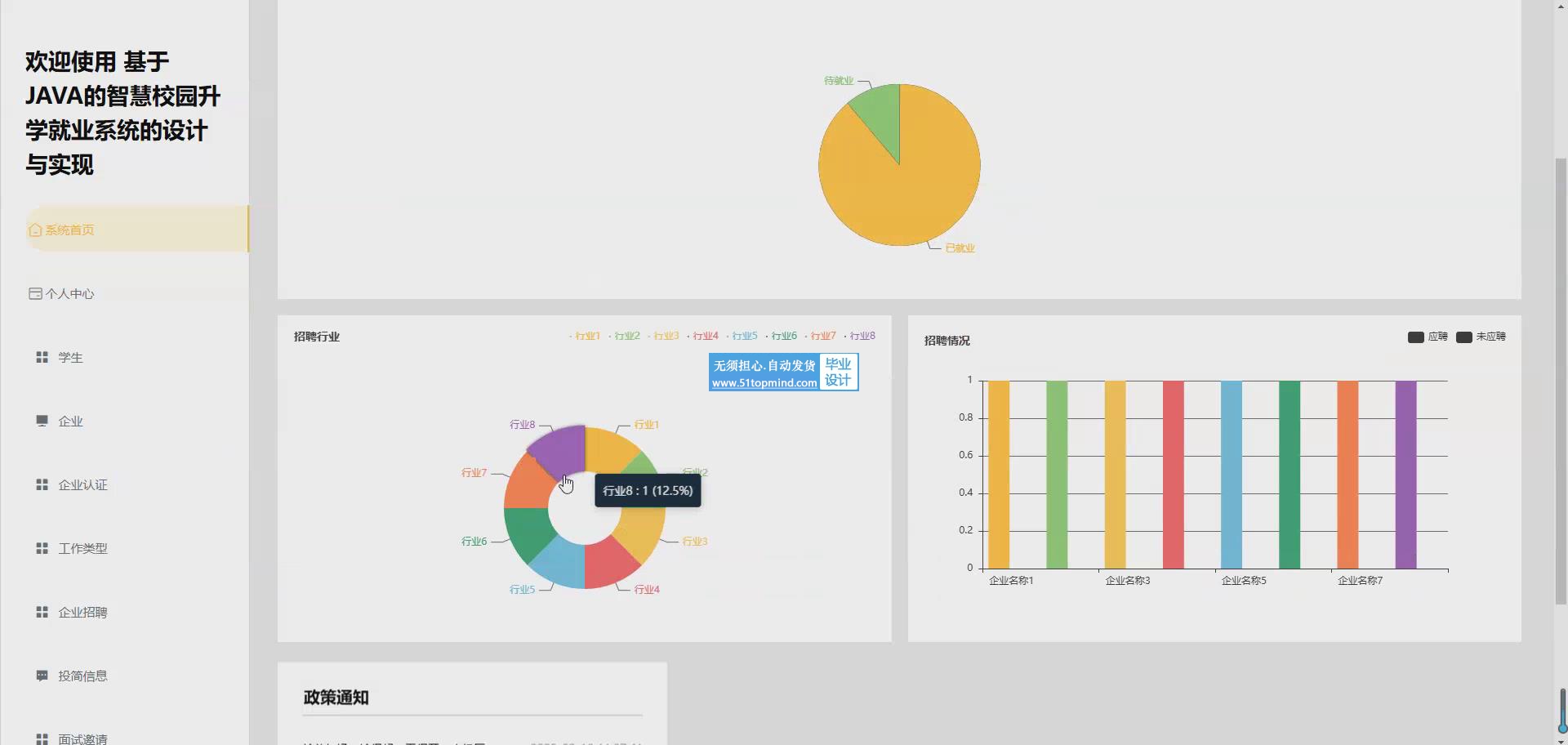 升学就业作为学生教育生涯中的重要环节,传统的管理模式已难以满足需求。为了更好地整合学校、学生和企业资源,实现升学就业管理的高效化、智能化,开发智慧校园升学就业系统迫在眉睫。在智慧校园升学就业系统的管理员端,管理员不仅需要管理个人信息,还需要管理首页、学生、企业、企业认证、工作类型、企业招聘、投简信息、面试邀请、应聘结果、简历制作等。此外,还需要查看数据等