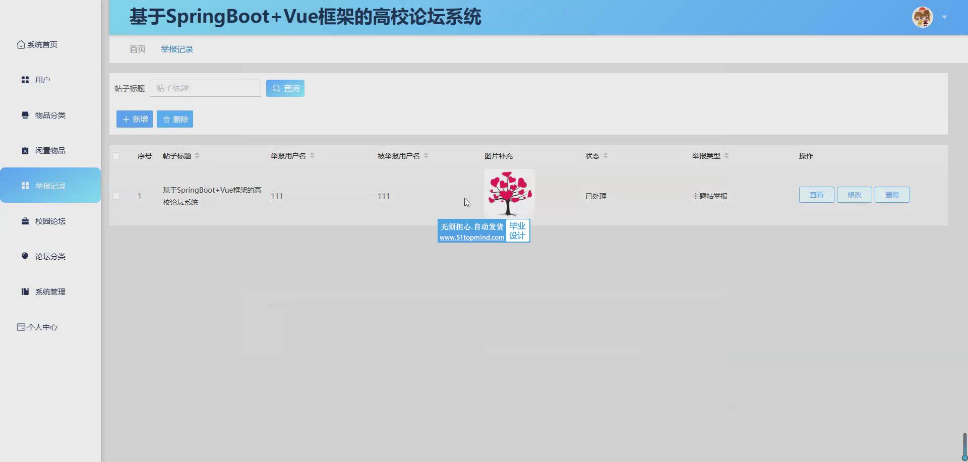 论坛首页可以按最新发布日期排列各个帖子,侧边栏可以选择不同的板块来查看不同类型的帖子,可以举报违规帖子;;用户可以上架出售闲置物品、购买别人的闲置物品,每个用户可以通过微信或支付宝充值余额。管理员负责用户的基本信息维护,可以进行闲置物品的发布,校园论坛信息管理,论坛分类管理、轮播图管理,公告管理等操作。