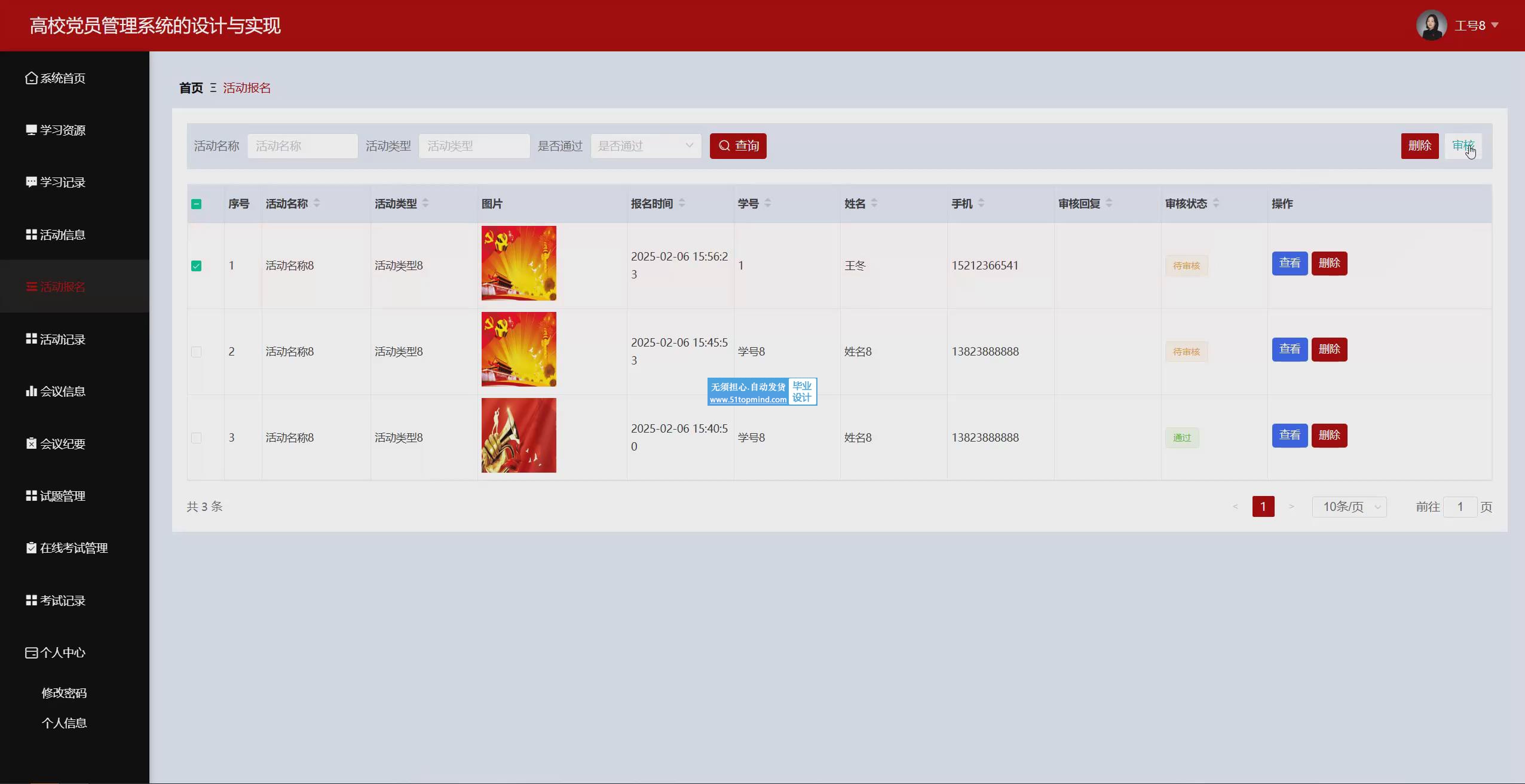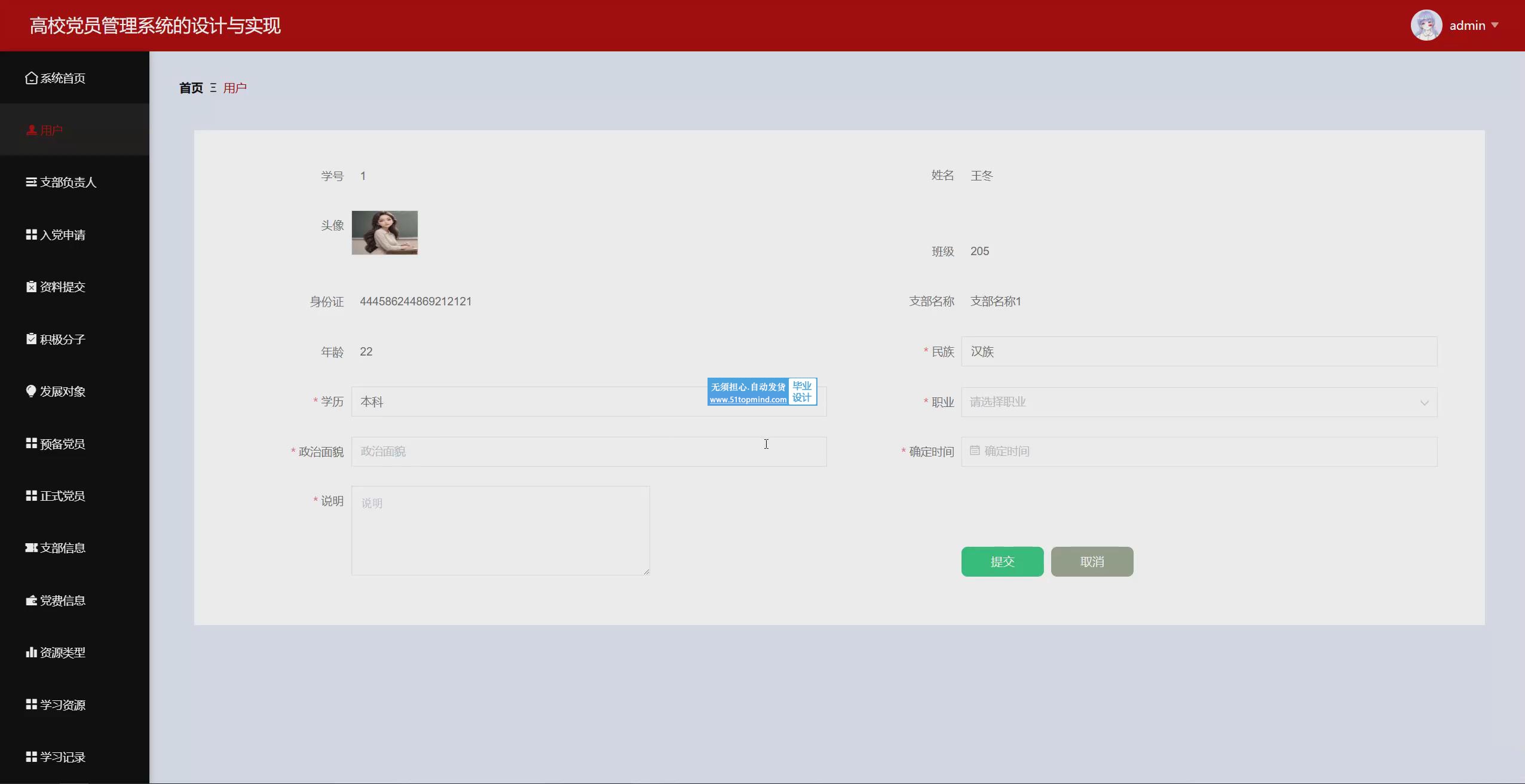第 5 章:系统的实现,此章是对系统中用户、支部负责人以及管理员这三类角色的主要功能的页面进行展示,并对每一功能的页面进行文字描述,说明其作用和操作方法。