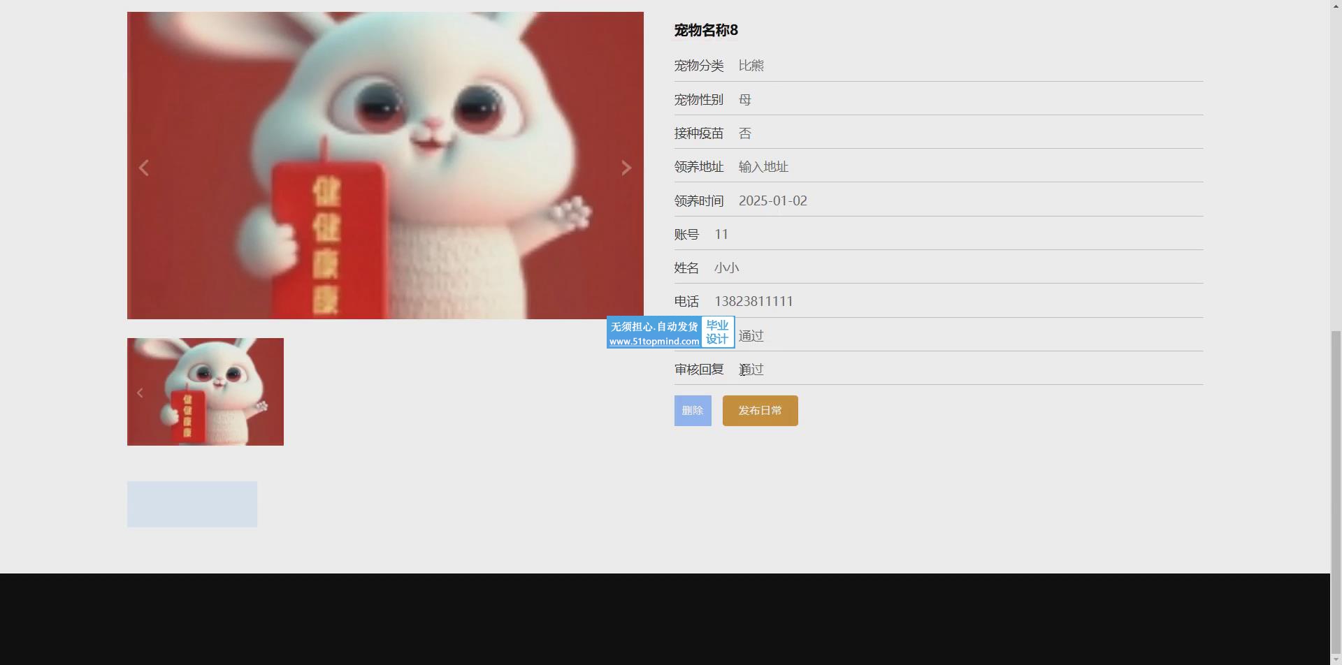 本系统采用B/S结构模式,支持多平台访问,用户无需下载客户端即可随时随地浏览和操作。同时,系统还具备良好的可扩展性和安全性,为宠物领养事业的健康发展提供了有力支持。