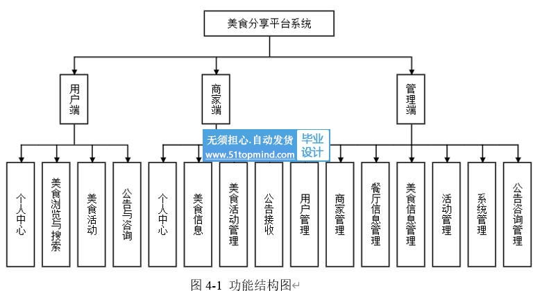 本文共分为七章。第一章绪论,阐述研究背景、意义、国内外研究现状及文章组织结构。第二章技术介绍,对开发平台所需的 MySQL 数据库、Java 语言技术、Spring Boot 框架、B/S 模式框架等技术进行详细讲解。第三章需求分析,从技术、经济、法律方面进行可行性分析,对用户、商家、管理员角色及功能进行分析,同时提出非功能性需求。第四章系统设计,包括系统结构设计,以及商家、用户、管理员主要功能设计和数据库设计。第五章系统实现,介绍系统开发与运行环境,阐述商家、用户、管理员功能的具体实现。第六章系统测试,说明测试目的、环境并给出测试用例。最后是结论、致谢和参考文献。