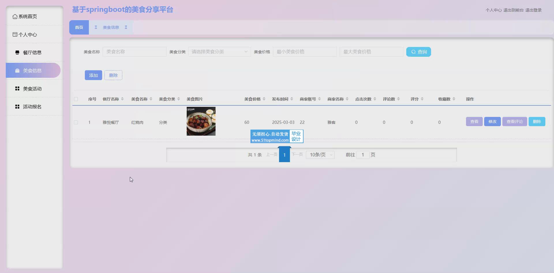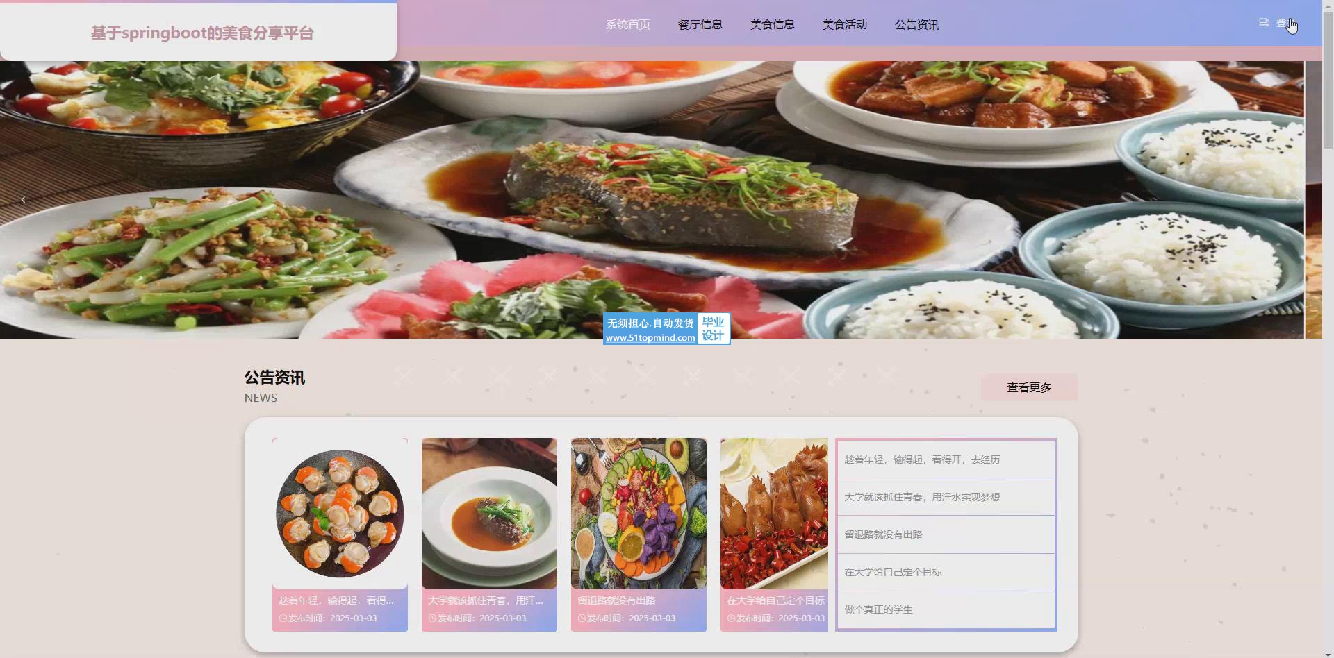 本文围绕基于 Spring Boot 的美食分享平台展开研究。阐述了在信息技术发展促使美食分享平台兴起的背景下,该平台在满足用户需求和技术应用创新方面的重要意义。详细分析了国内外美食分享平台的研究现状,介绍了开发所涉及的多种技术。通过可行性分析、角色与功能需求分析进行系统设计,涵盖系统结构、商家、用户、管理员功能设计及数据库设计。还阐述了系统开发与运行环境,并对商家、用户、管理员功能实现进行探讨,为美食分享平台的建设提供了全面的方案。